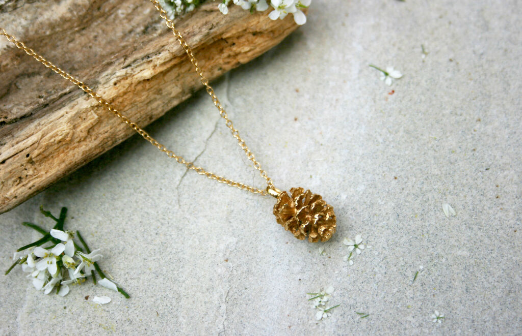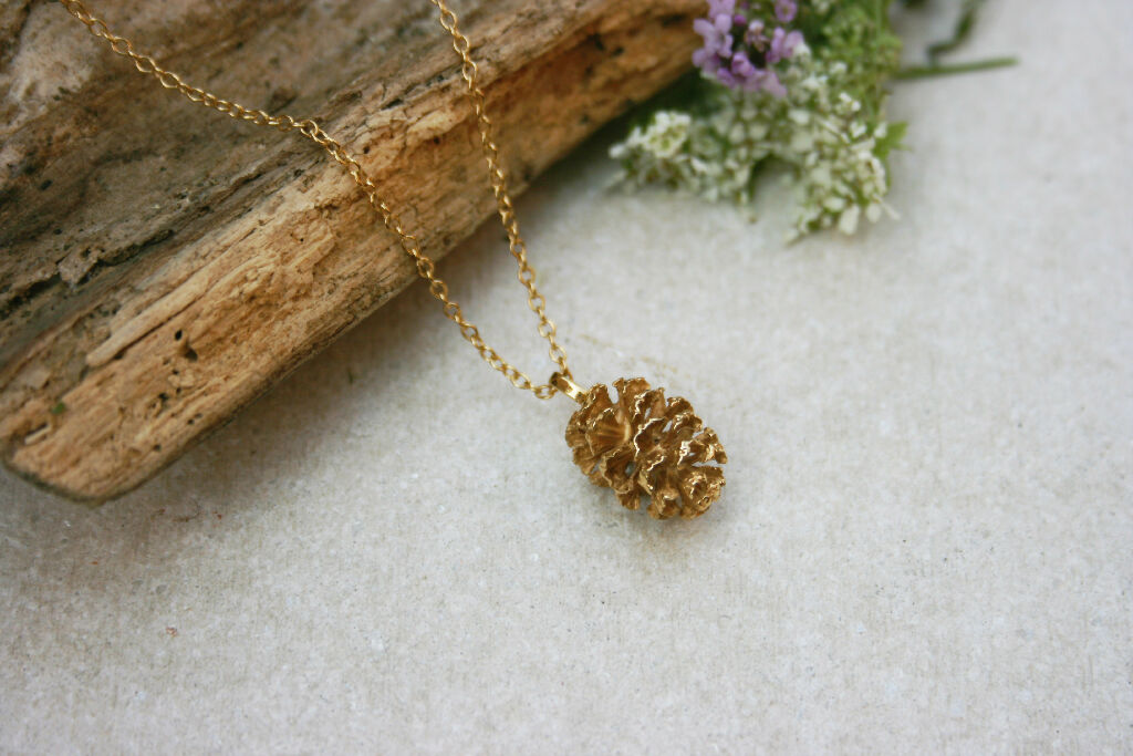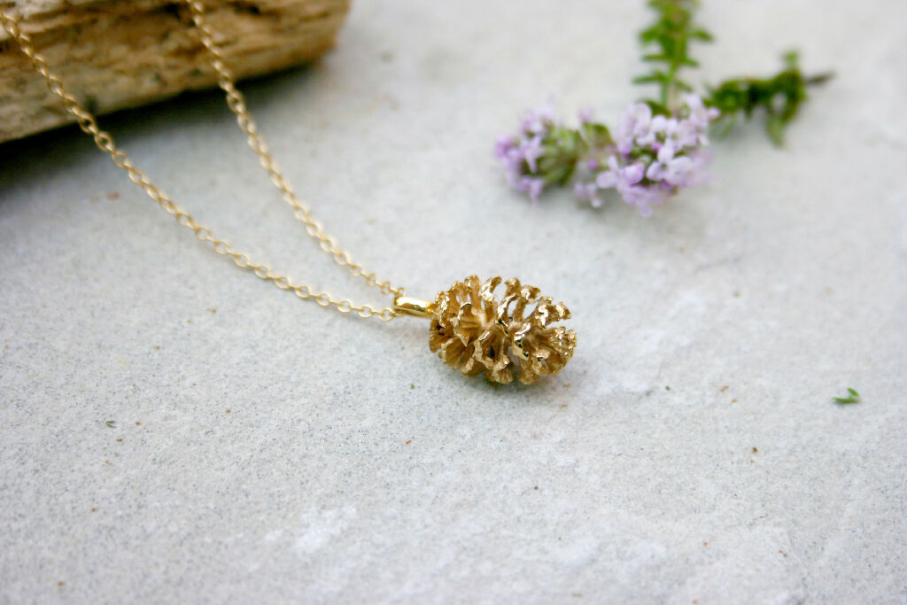Materials: Pinecone: Pure gold-plated 925 Sterling Silver; Bail: Pure gold-plated 925 Sterling Silver; Chain: 14ct Yellow Gold Fill