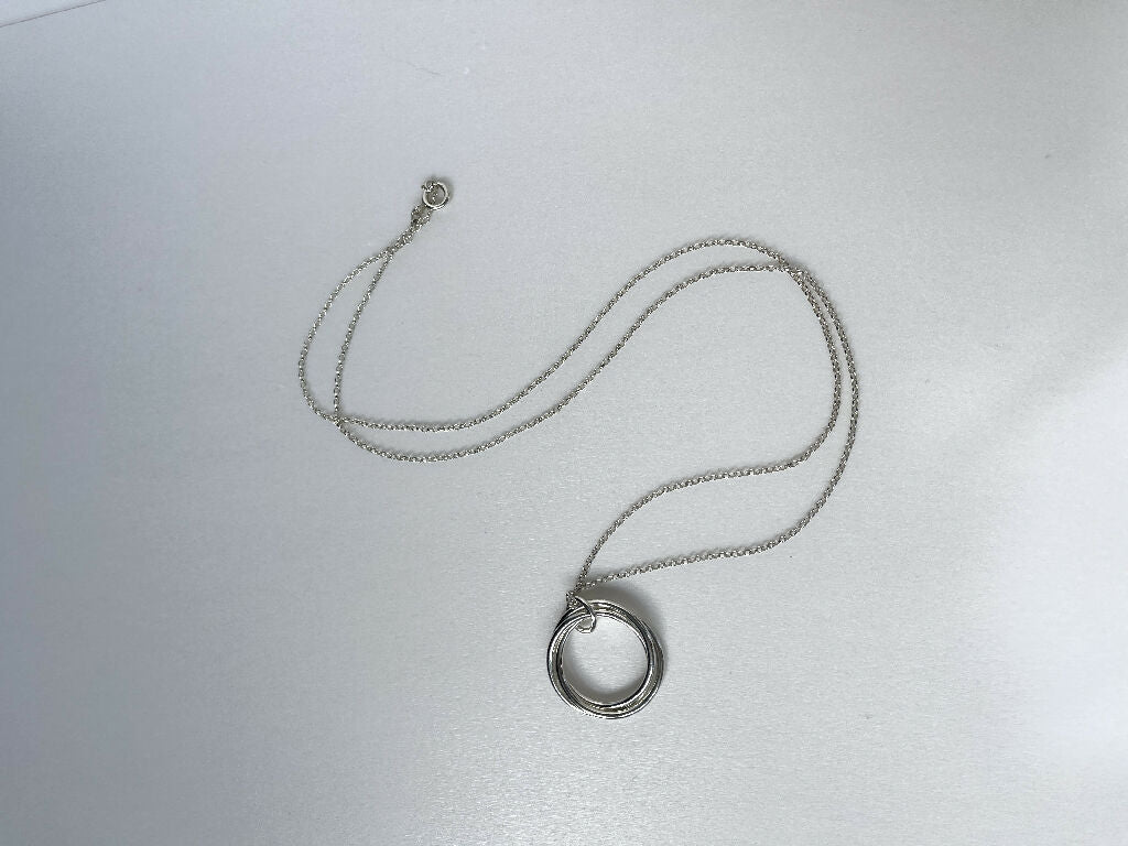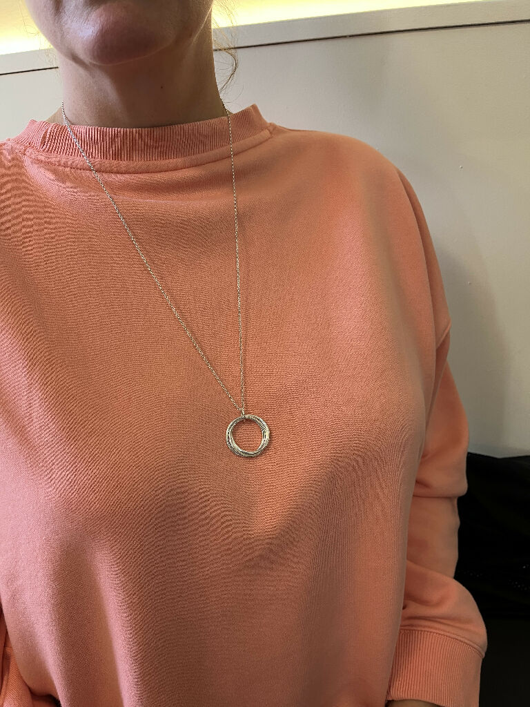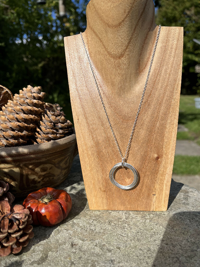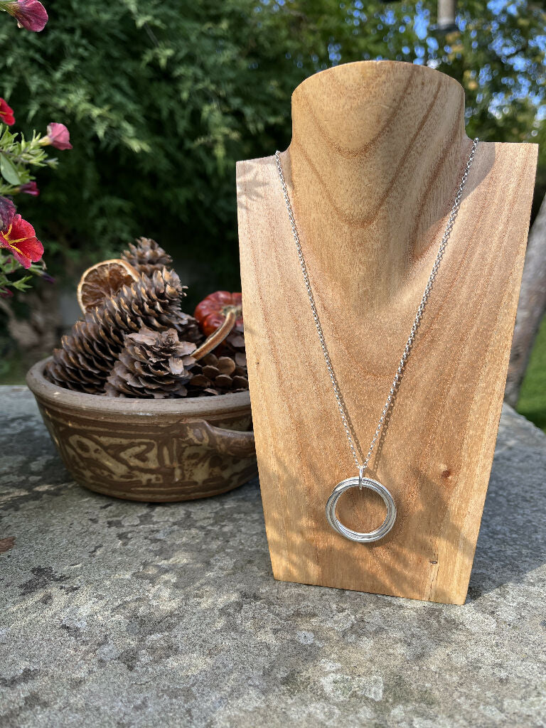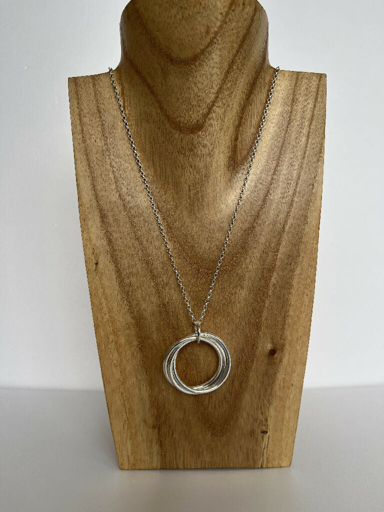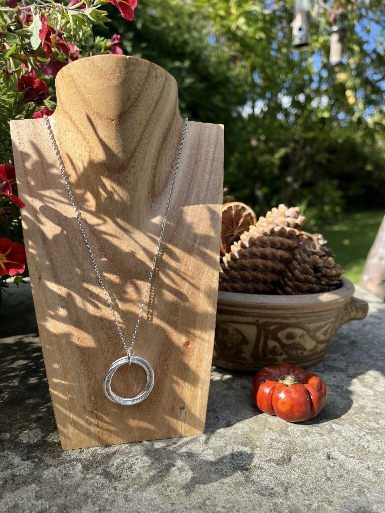 This handmade 925 sterling silver pendant is made in the style of a Russian wedding ring, and is hung on a fine silver chain. The three circular hoops are made separately and then interlocked, giving a simple sophisticated look which has movement and fluidity.