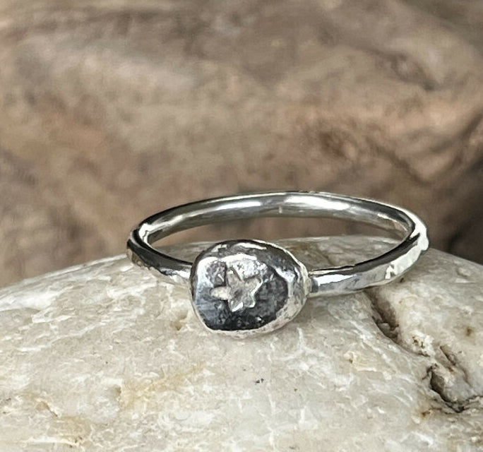 A unique pebble shaped ring handmade with recycled sterling silver, hand stamped with a star.