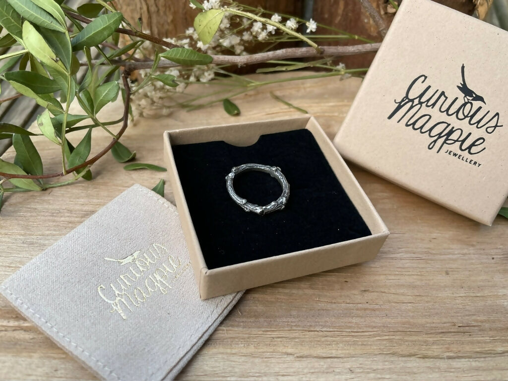 Handcrafted using traditional Lost Wax Casting, each Silver Twig Ring is made from a real twig, cast into solid sterling silver. No two rings are the same, making each piece completely unique.