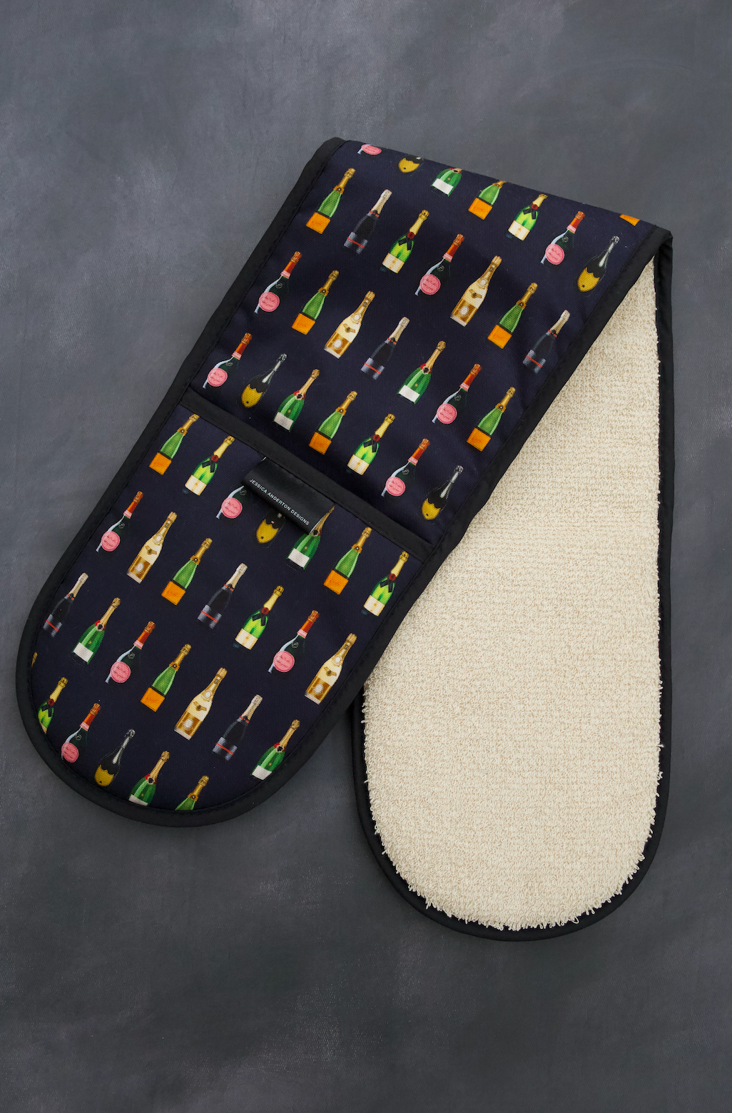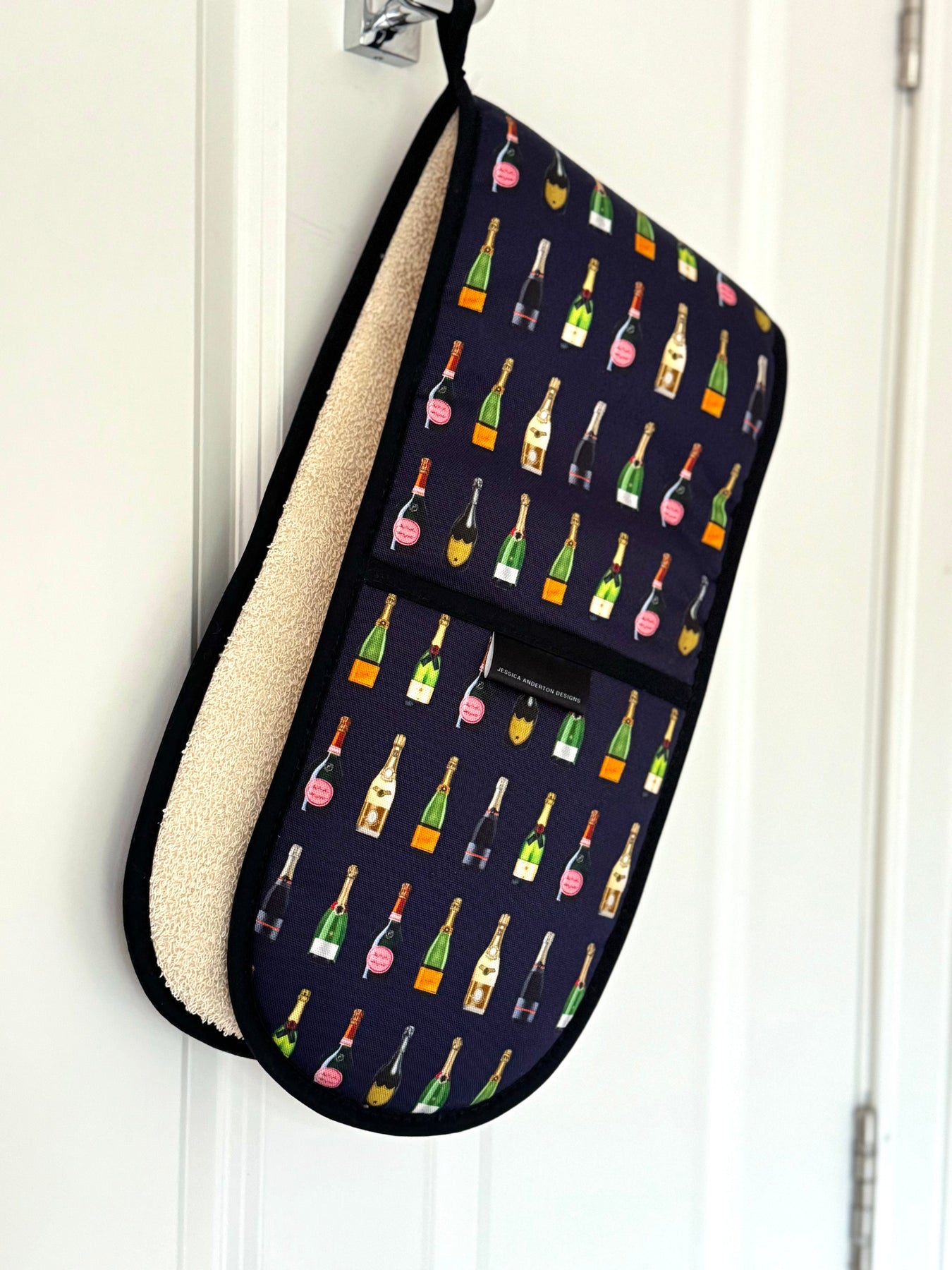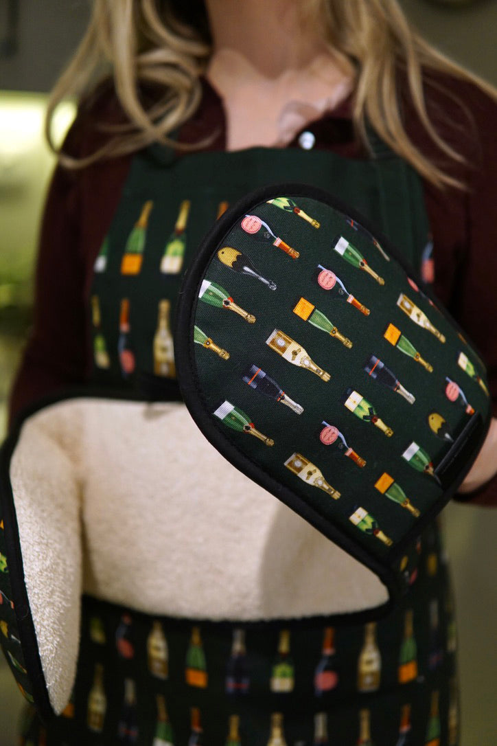Beautifully bright & proudly made in Britain, these carefully crafted 'Champagne & Fizz' Double Oven Gloves are the perfect partner for the kitchen. Finished with a thick, heat-resistant terry towelling for protection, ensures these kitchen essentials are fit-for purpose as well as being stylish. Available in two colourways; Navy and Dark Green.