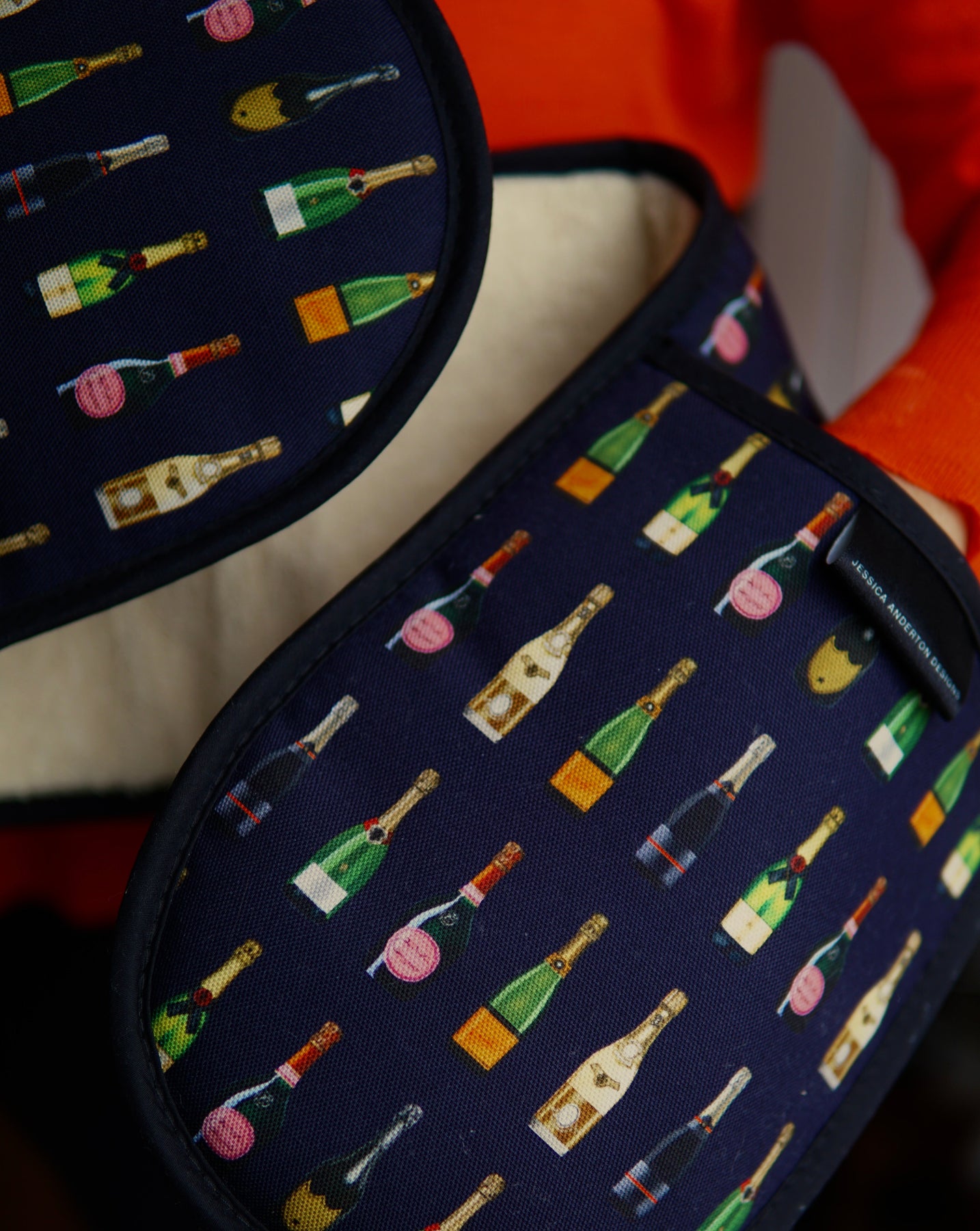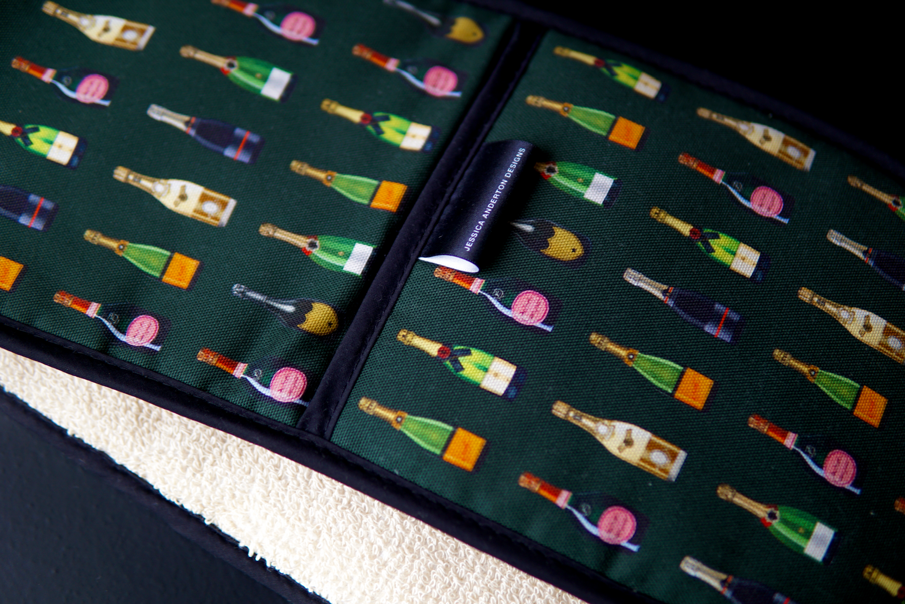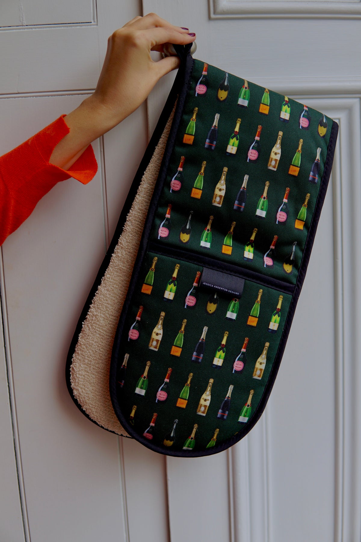 Beautifully bright & proudly made in Britain, these carefully crafted 'Champagne & Fizz' Double Oven Gloves are the perfect partner for the kitchen. Finished with a thick, heat-resistant terry towelling for protection, ensures these kitchen essentials are fit-for purpose as well as being stylish. Available in two colourways; Navy and Dark Green.