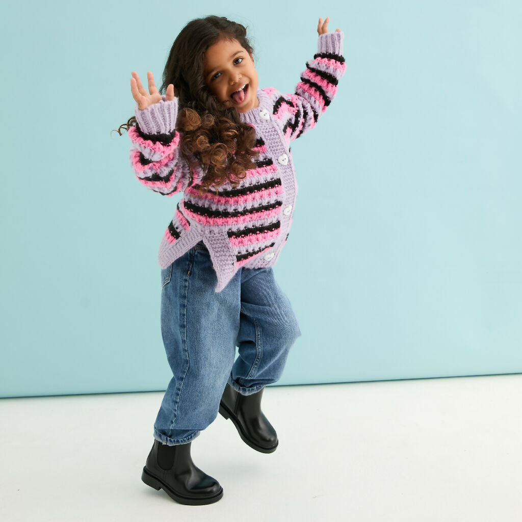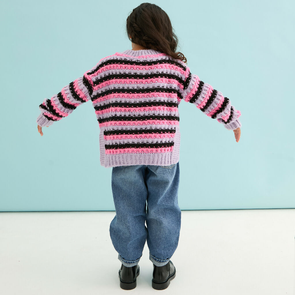 A fun-size version of our statement Bernice Cardigan, designed for little trendsetters who love to twin with Mum. Bold stripes, a comfy oversized fit and playful details that bring colour to every day.