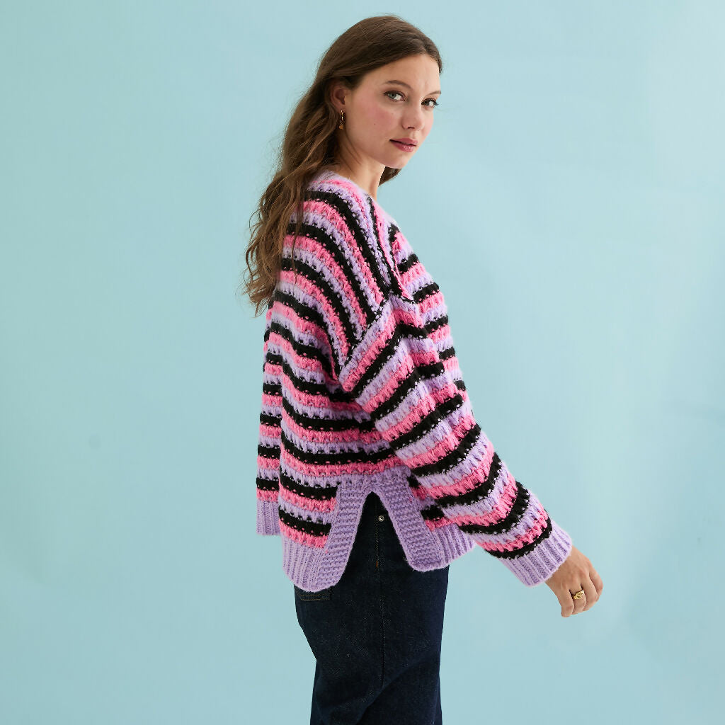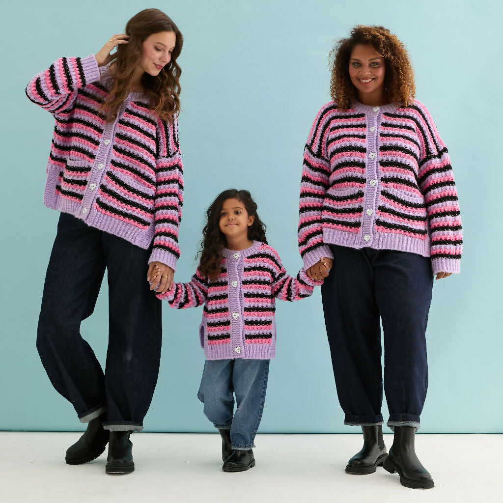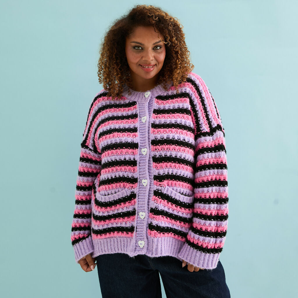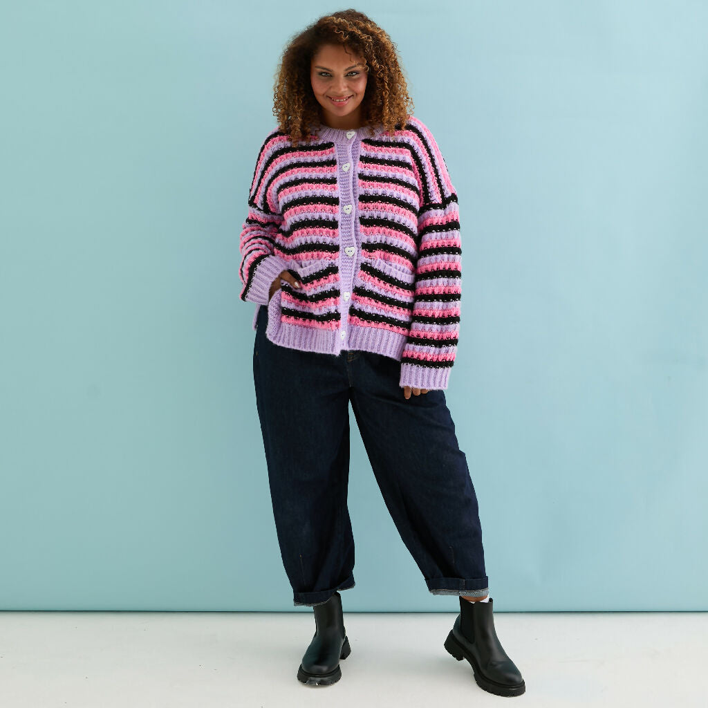 Ready to add some colour to your knitwear rotation? Bernice is your feel-good fix 💜. A bold striped cardigan in lilac, pink and black, finished with playful heart-shaped buttons and chunky rib trims for that extra touch of fun. Designed with a very relaxed, oversized boxy fit, she’s cosy, comfy and full of dopamine-dressing energy.Â