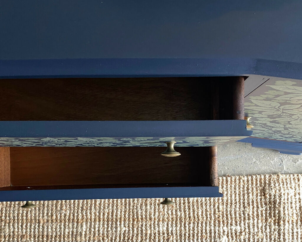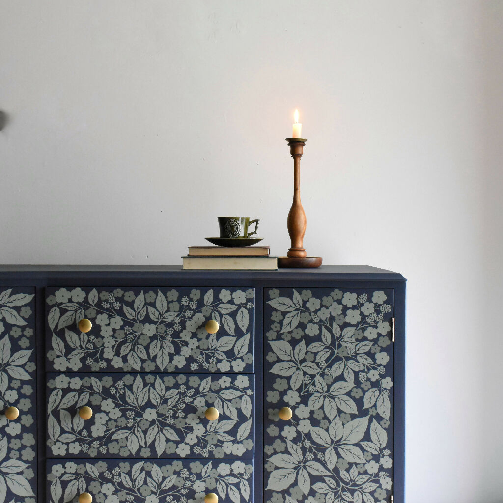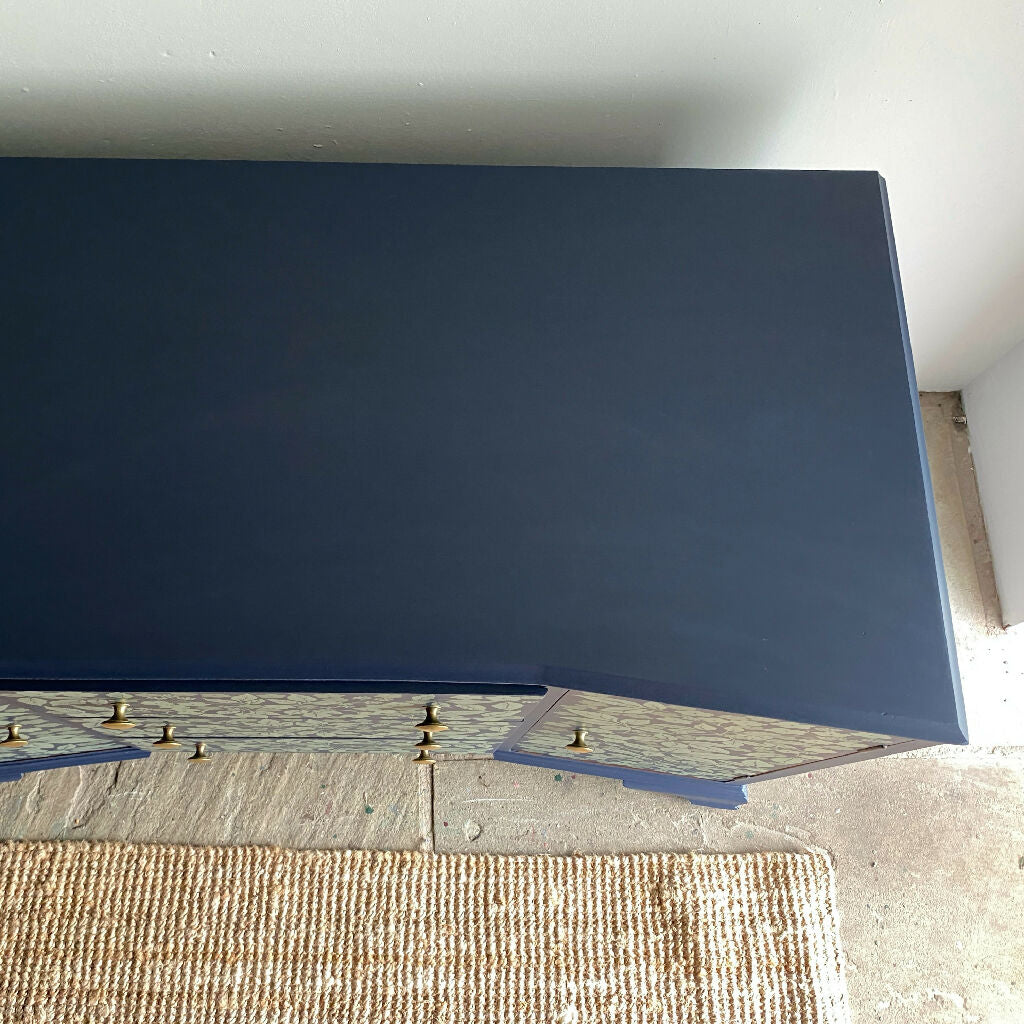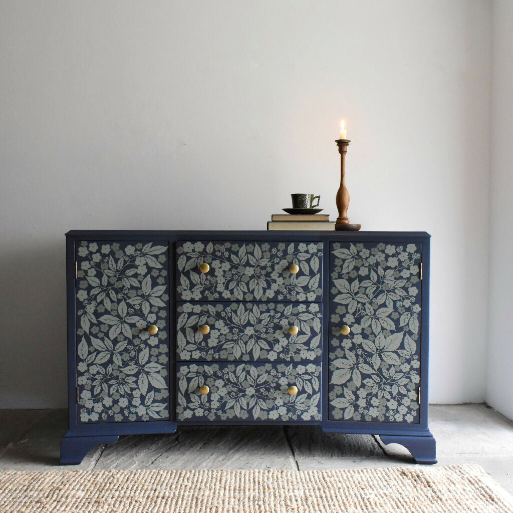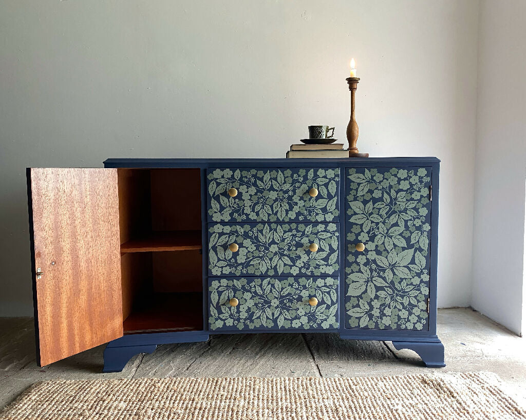 Hand painted navy blue and sage green decorative hedgerow details adorn this versatile midi sideboard. Comprising of three smooth running drawers, two handy storage cupboards with shelves and brushed gold hardware detailing.