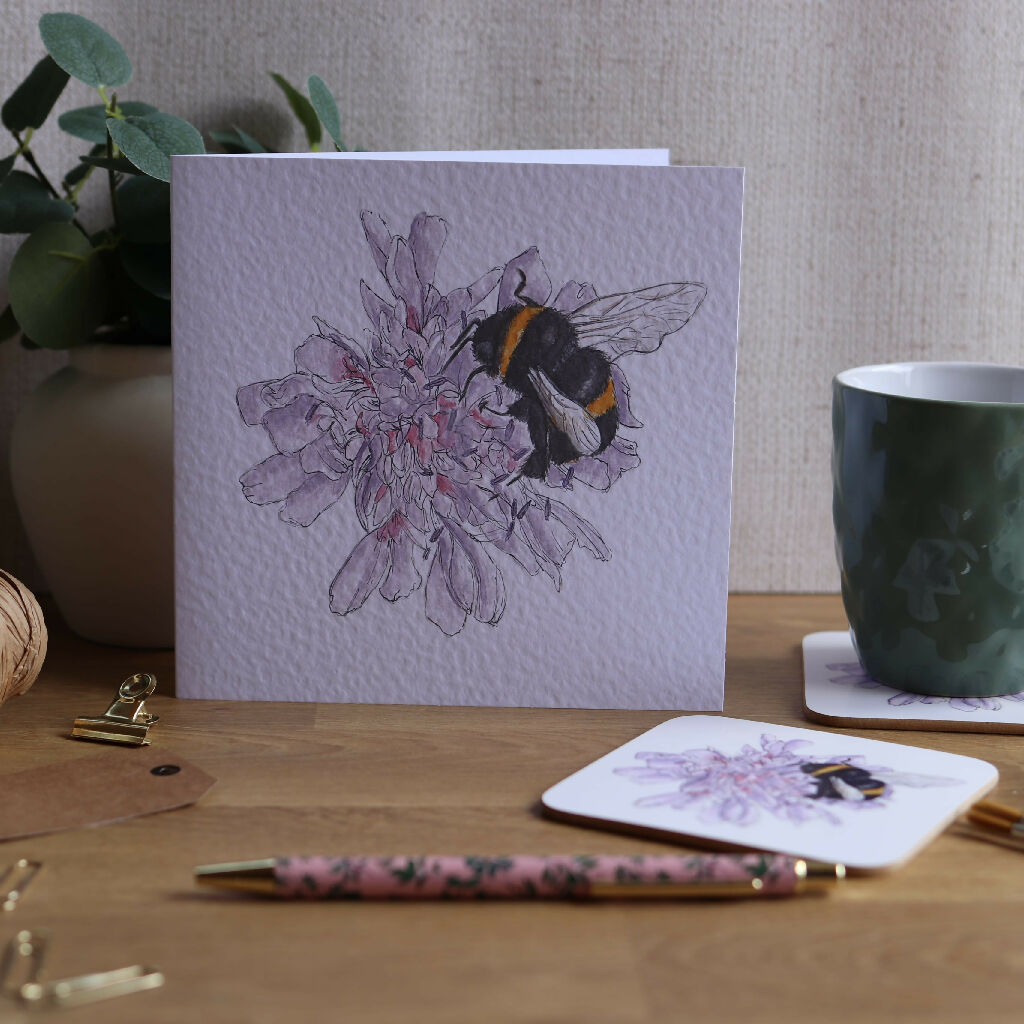Featuring a watercolour illustration of a bumble bee sat on a dahlia flower. Why not create the perfect gift and pair it with a matching keyring or coaster.