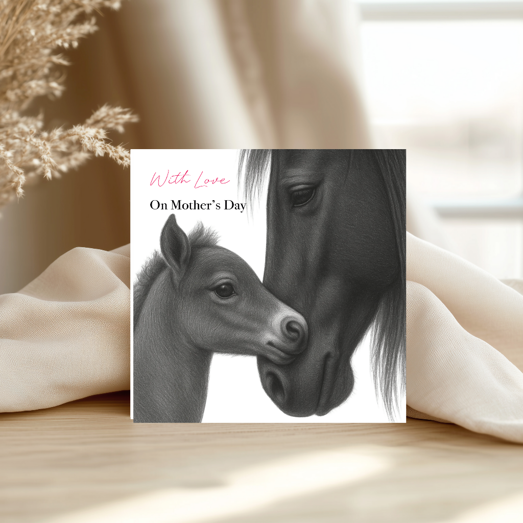 Capture the gentle strength of motherhood with this elegant Horse and Foal Mother’s Day Card. Featuring a tender equine illustration of a mare standing protectively beside her foal, this design beautifully reflects nurturing love, guidance and devotion.