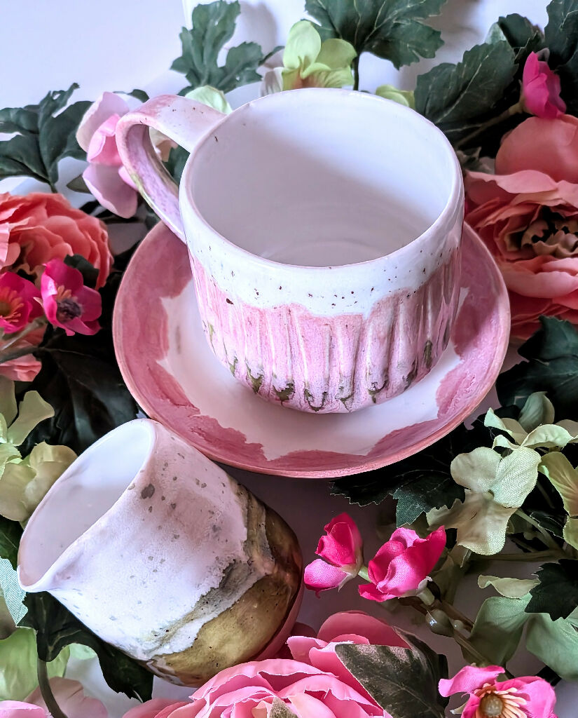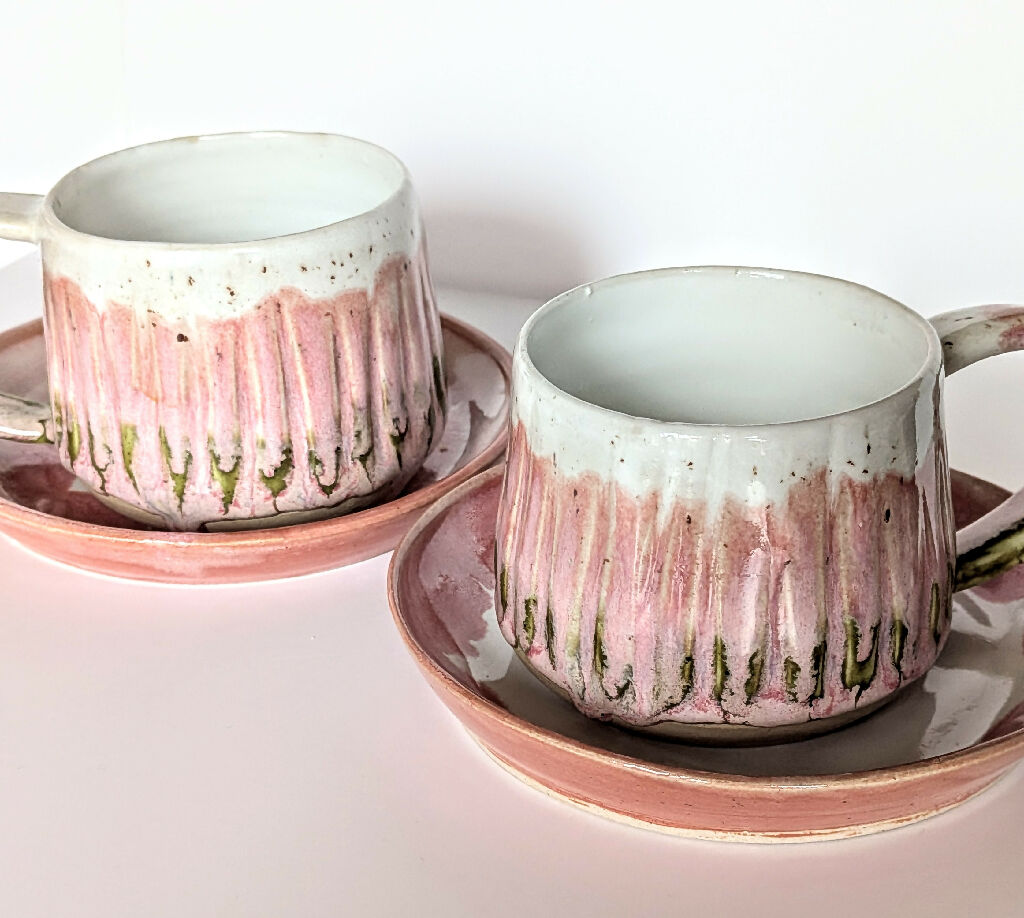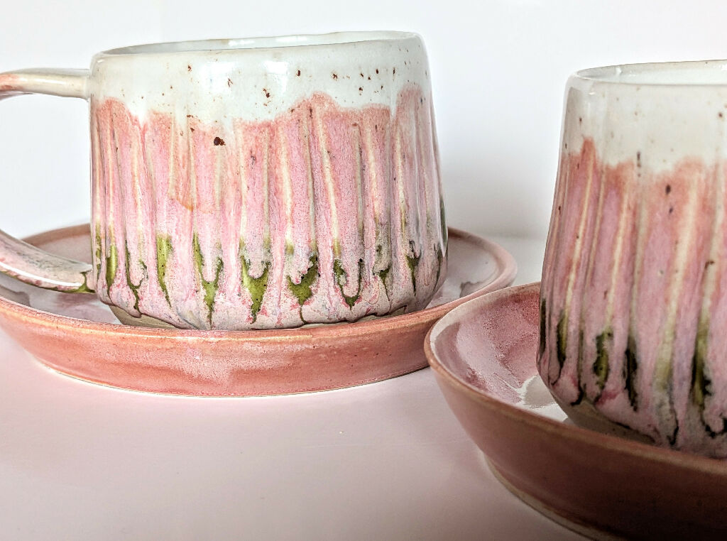 Hand-Thrown Stoneware Tea Cup & Saucer Set – Moss & Blossom Glaze. Bring a sense of calm beauty to your tea ritual with this handcrafted set of stoneware tea cup and mat...