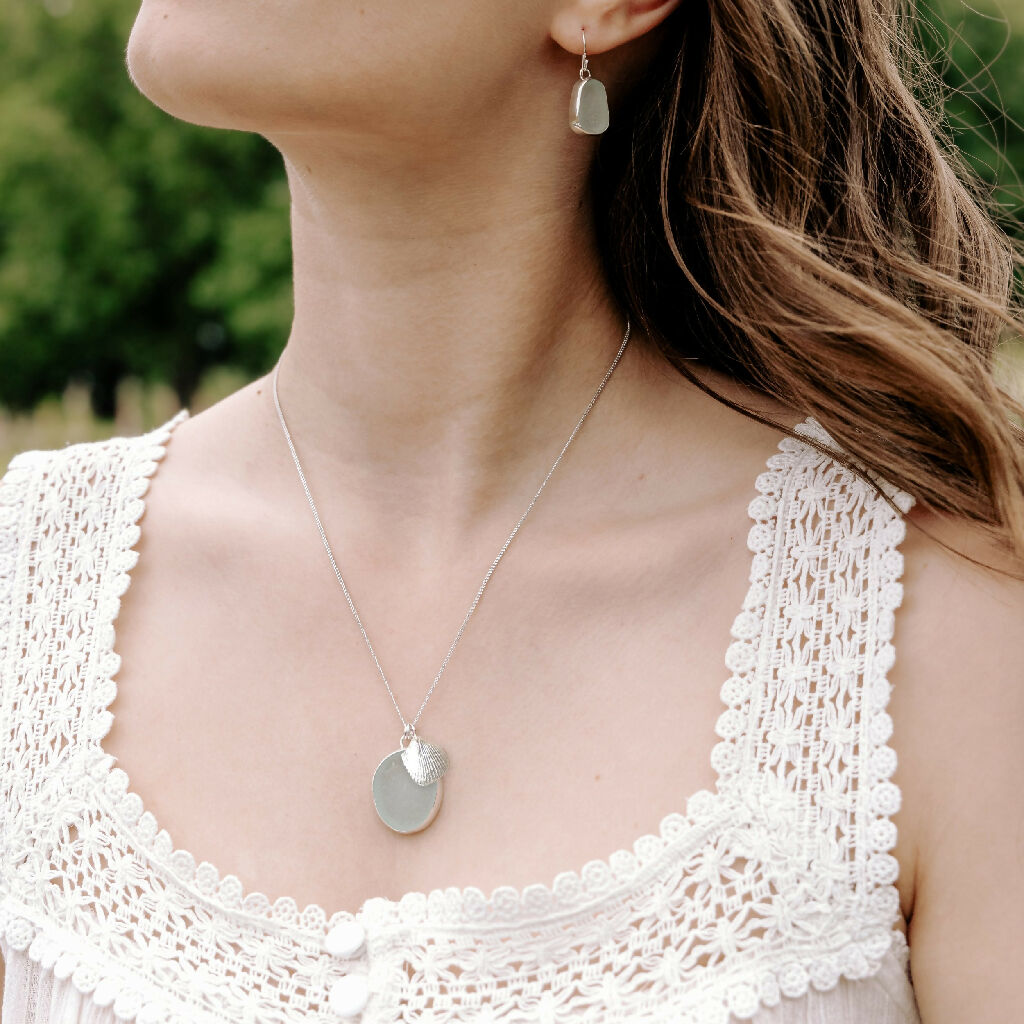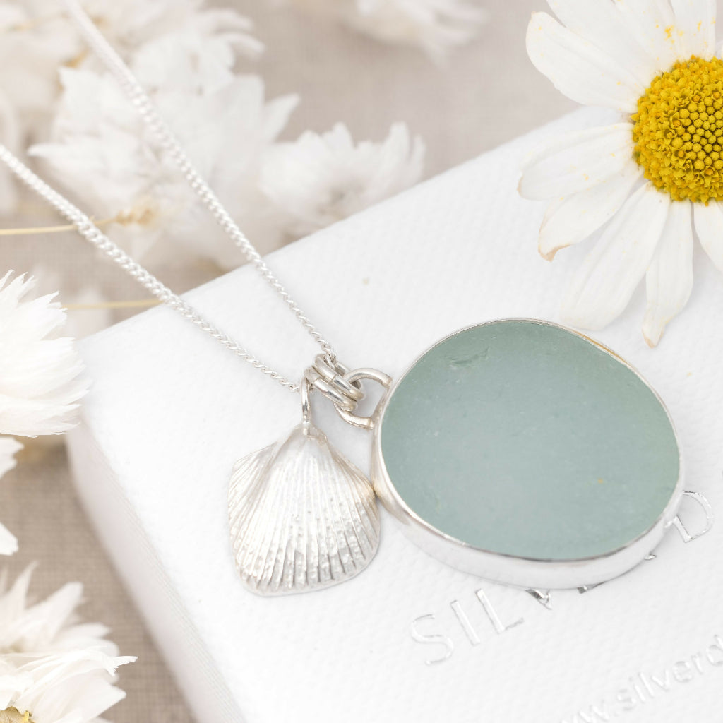 One a sea glass pebble foraged from one of Britain’s beaches which is set in a handcrafted silver bezel setting with an open back to allow light to pass through the glass. showing off its gorgeous texture and aquamarine colour. The other charm, a solid silver cockle shell pendant handmade from fine silver.