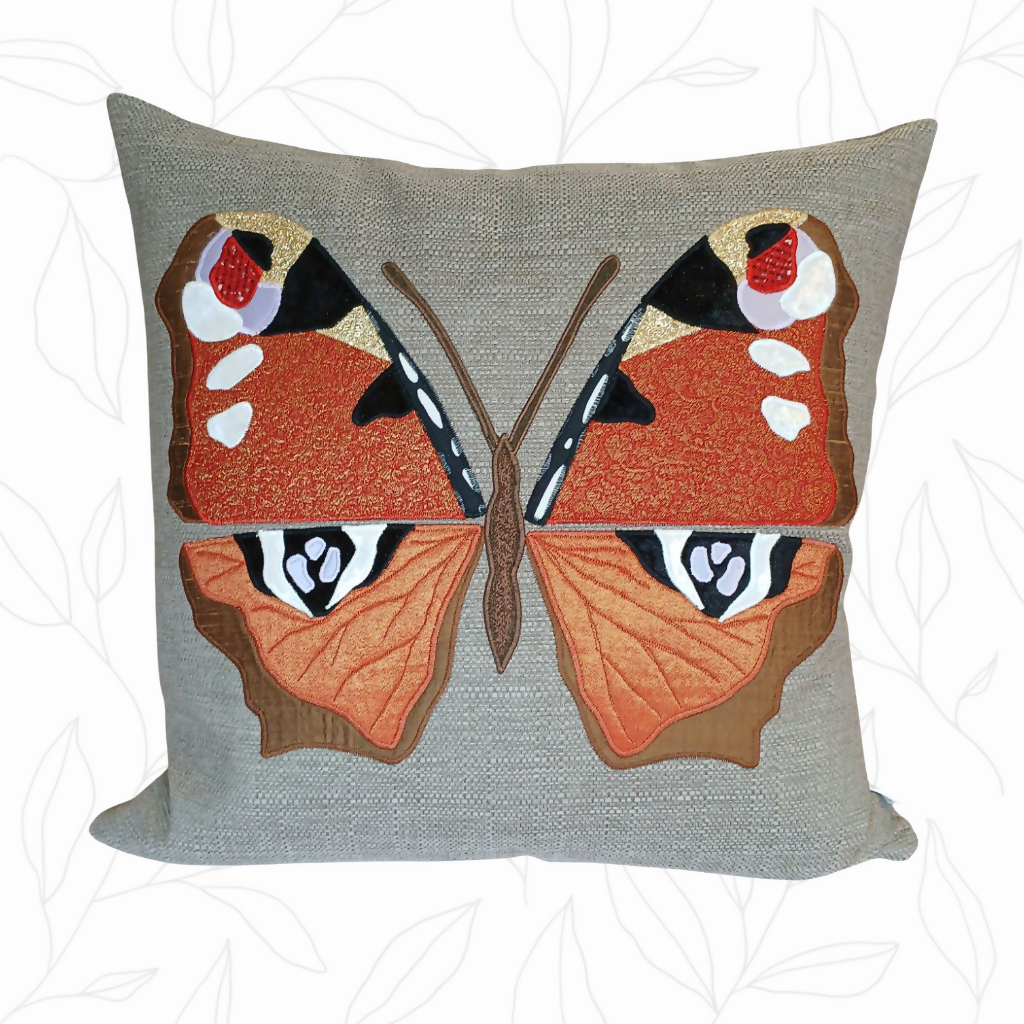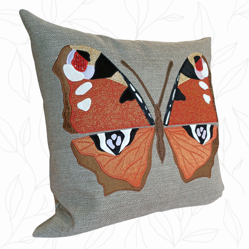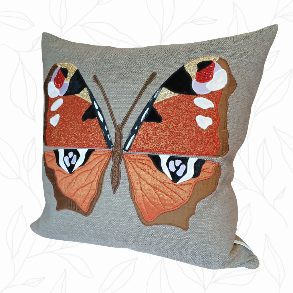 Bring a touch of countryside charm to your home with this 20” square cushion, handmade in my Somerset studio. It features a unique peacock butterfly design created using delicate raw-edge appliqué, carefully crafted to celebrate character and individuality.