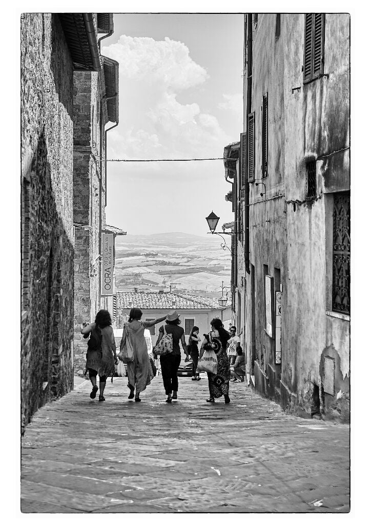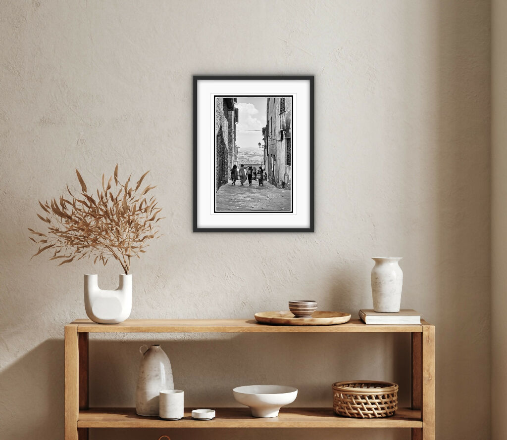 An evocative black and white photograph portrays four young ladies, walking side by side through the old streets. Each carries shopping bags, suggesting a fruitful morning spent exploring local boutiques, perhaps now headed to lunch together to enjoy the town’s culinary delights. Printed on premium fine art paper and presented in elegant black frames with a deep black inlay