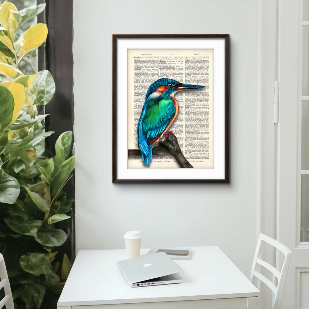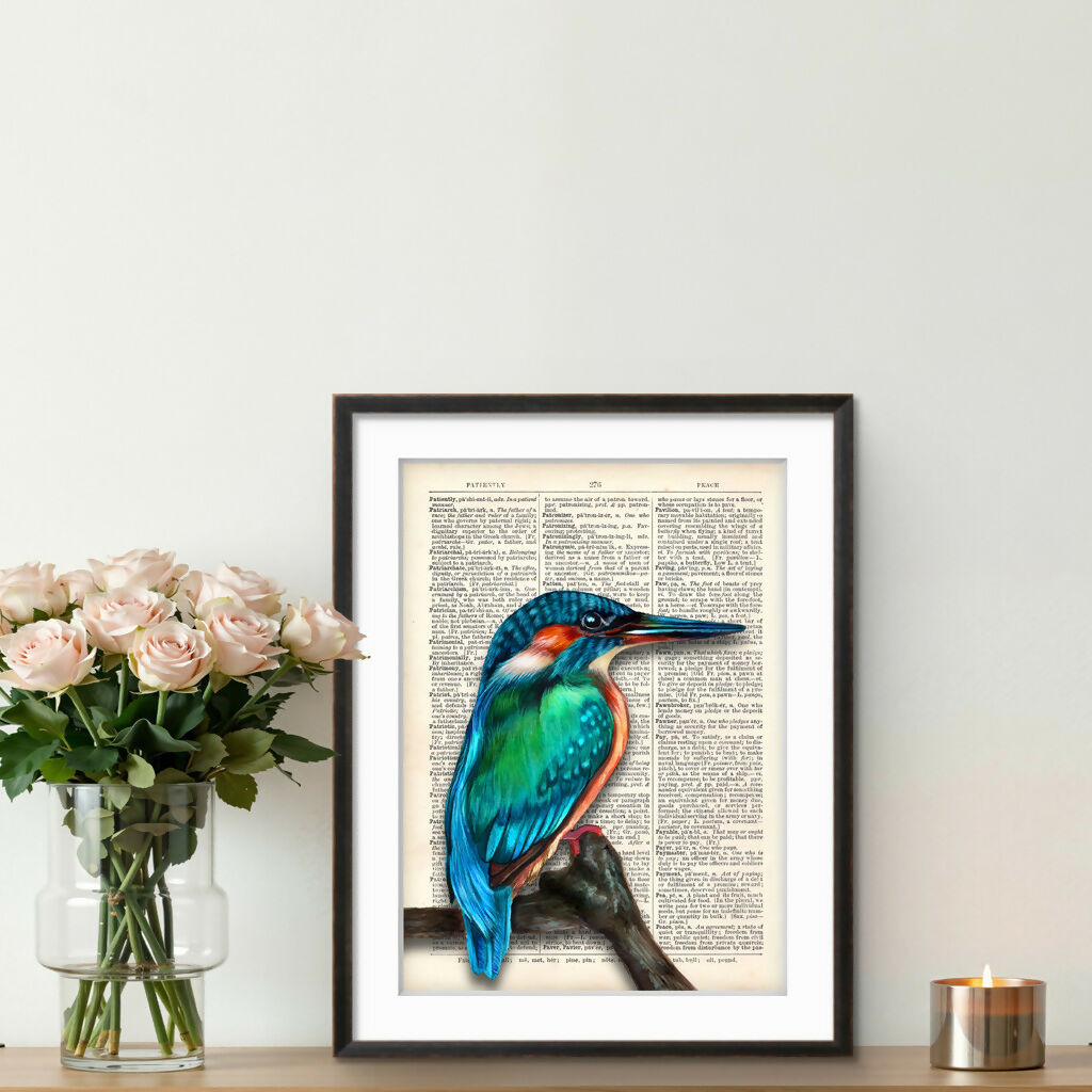 Bring a splash of colour and countryside charm into your home with this beautiful Kingfisher art print, created using a genuine vintage dictionary page. Featuring the striking turquoise, teal and copper tones of the kingfisher perched on a branch, this piece blends classic book art with detailed wildlife illustration.