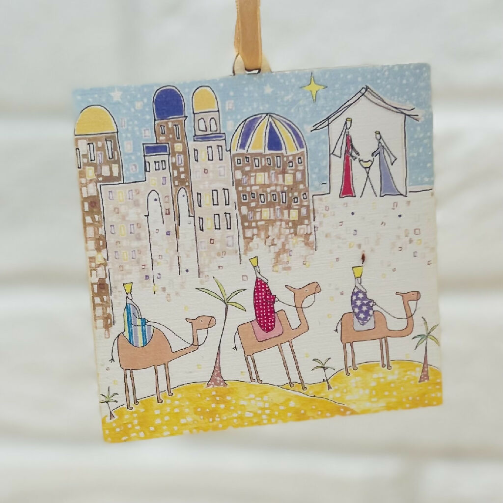 A stunning wooden Christmas decoration featuring Lottie's original hand-drawn 'Following the Star' design, made in the UK with sustainable materials.