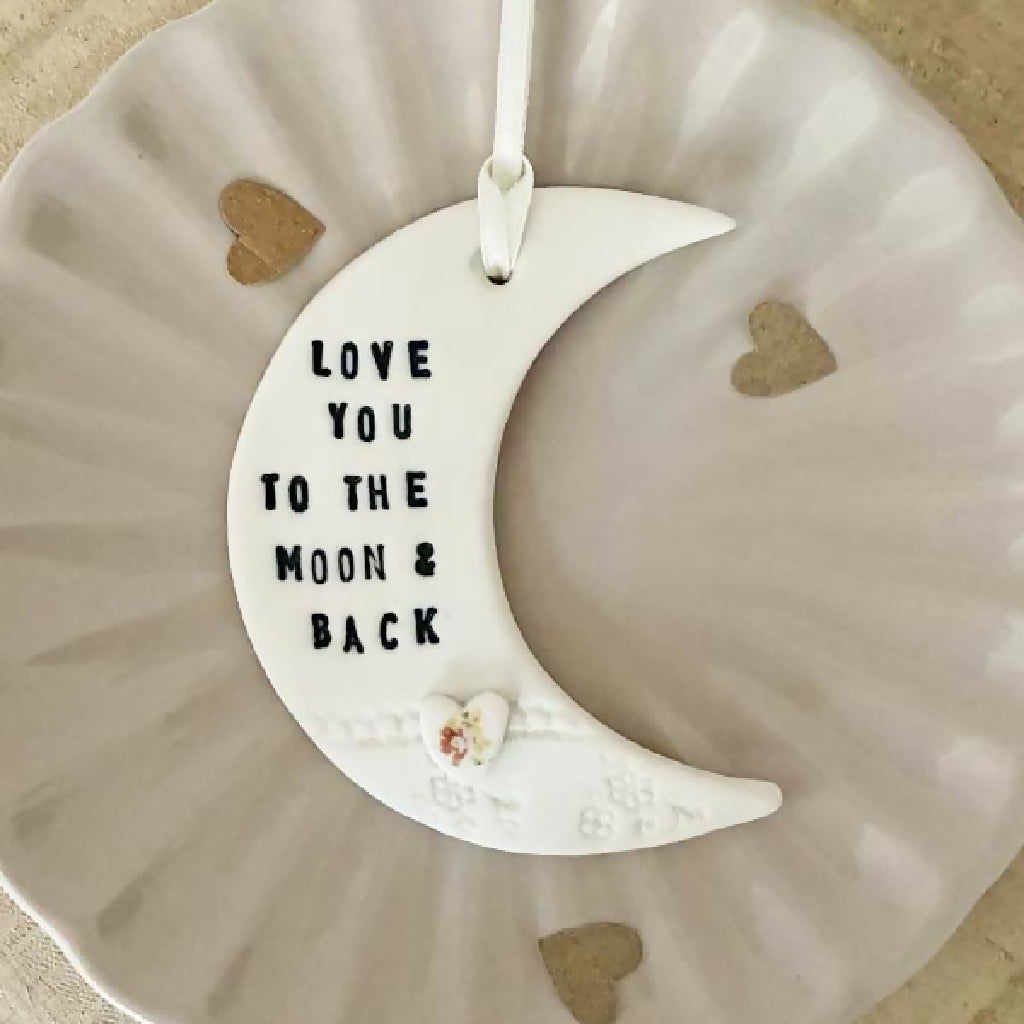 A sweet moon decoration. Hand-crafted from fine white porcelain with the words 'Love you to the moon and back' stamped in to the surface with a lace imprint and tiny heart detail.