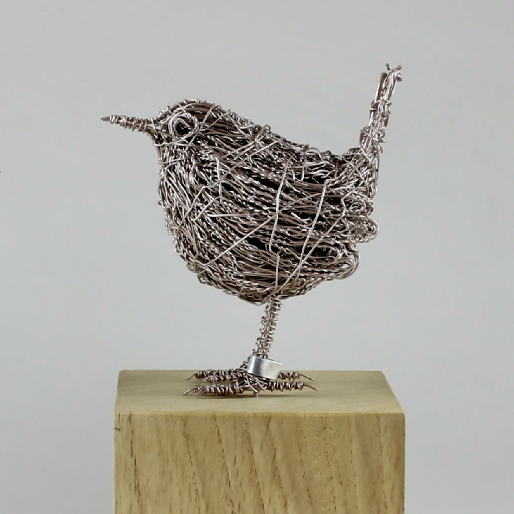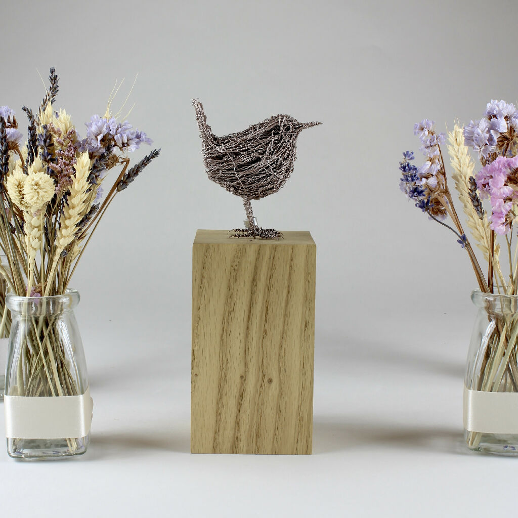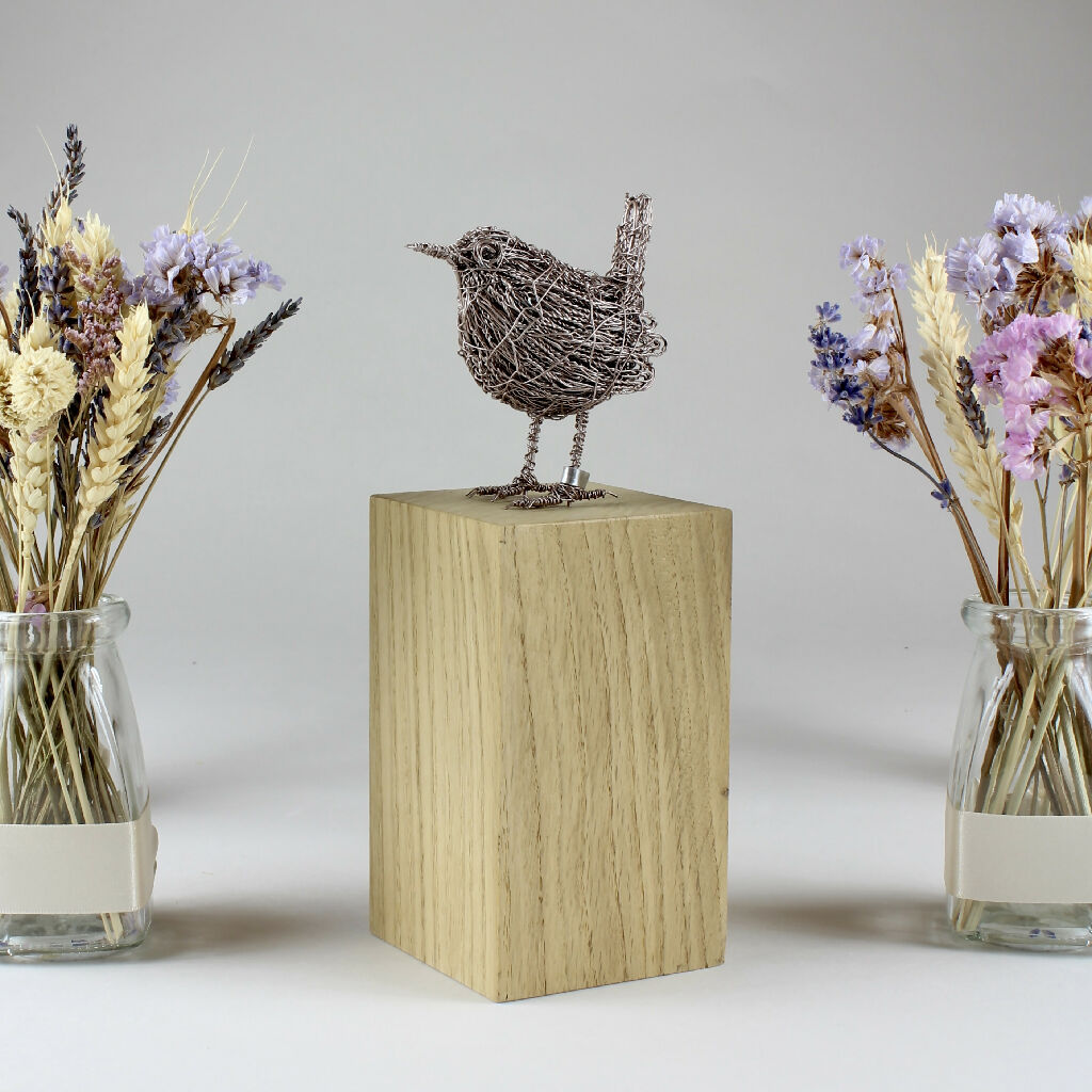 After being carefully handmade and then painted, the wren has been mounted on a kiln dried solid oak plinth, which has the artist's name engraved discreetly on the side. The wren also has a small leg ring attached which has the artist's initials on.