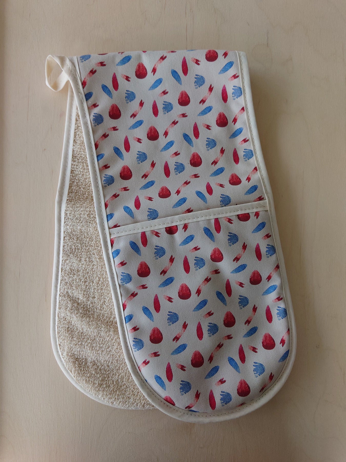 A stylish and practical pair of double oven gloves in the Machair Petals - multi collection hand-painted design. Luxury weight 309gsm 100% Organic cotton fabric for a longer las...