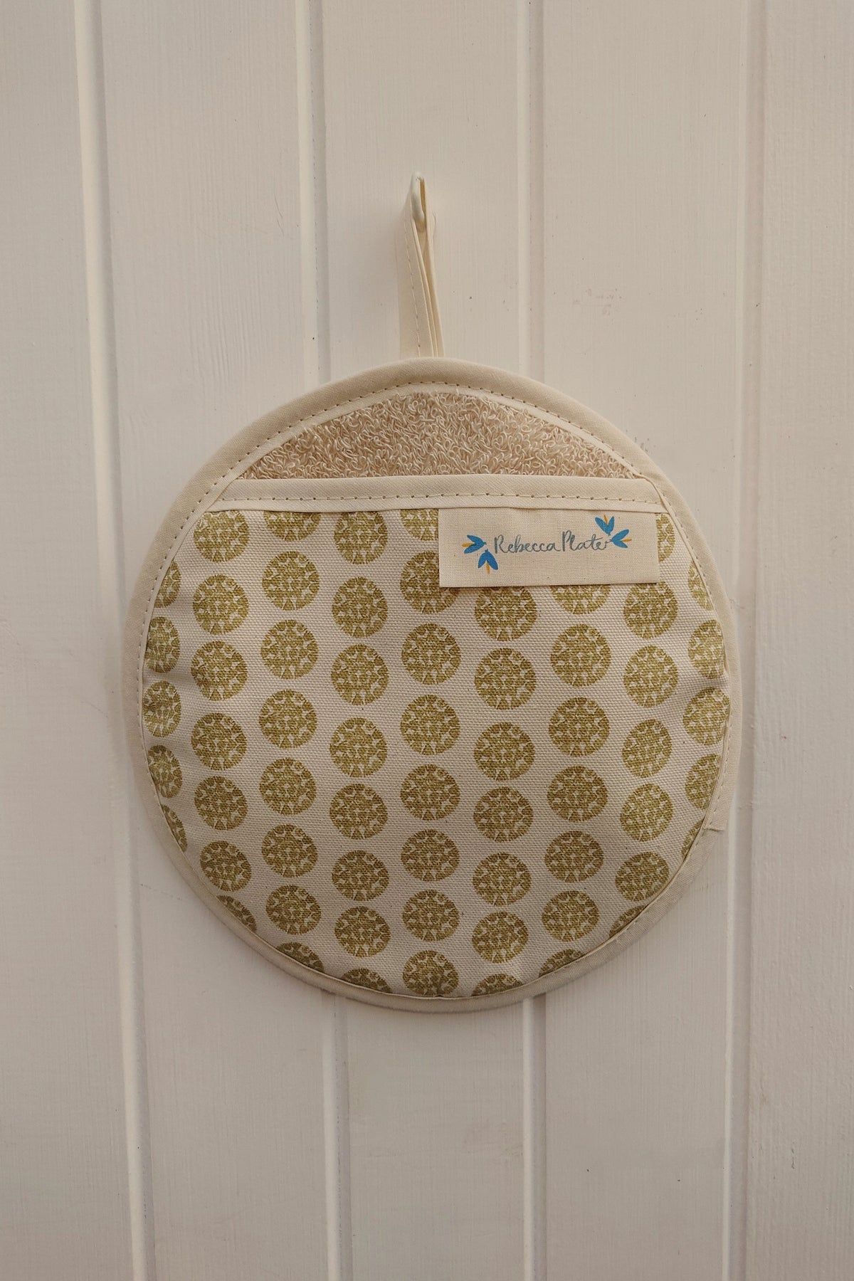 Stylish and practical Organic Pot Grab and Oven Mitt in the Machair Clock Gold Green collection hand-painted design. A stylish and practical addition to any kitchen. Designed to be quick and easy to slip on your hands to keep them free whilst moving quickly with more ease around the kitchen.