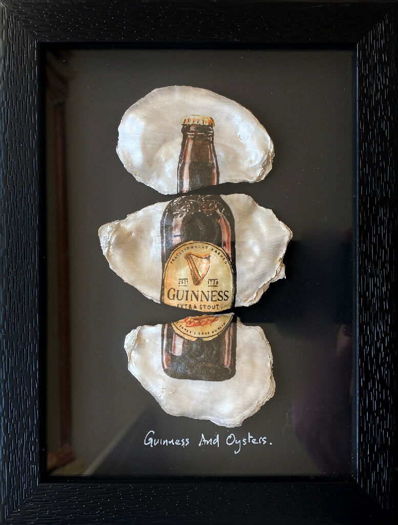 This is a Triptych of decorated oyster shells featuring a copy of my original watercolour painting of the iconic Guinness bottle.
