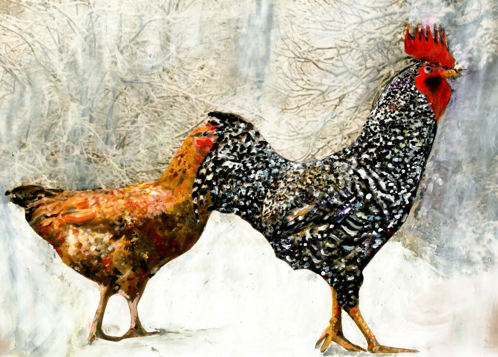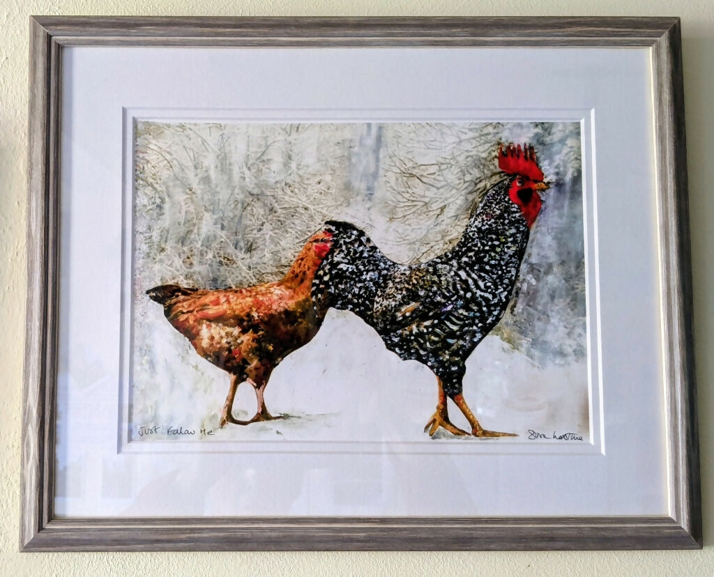 A beautiful festive original painting also to make everyone laugh. Just Follow Me. Bright plumage of both birds stands out against the Snowy background The painting is titled...