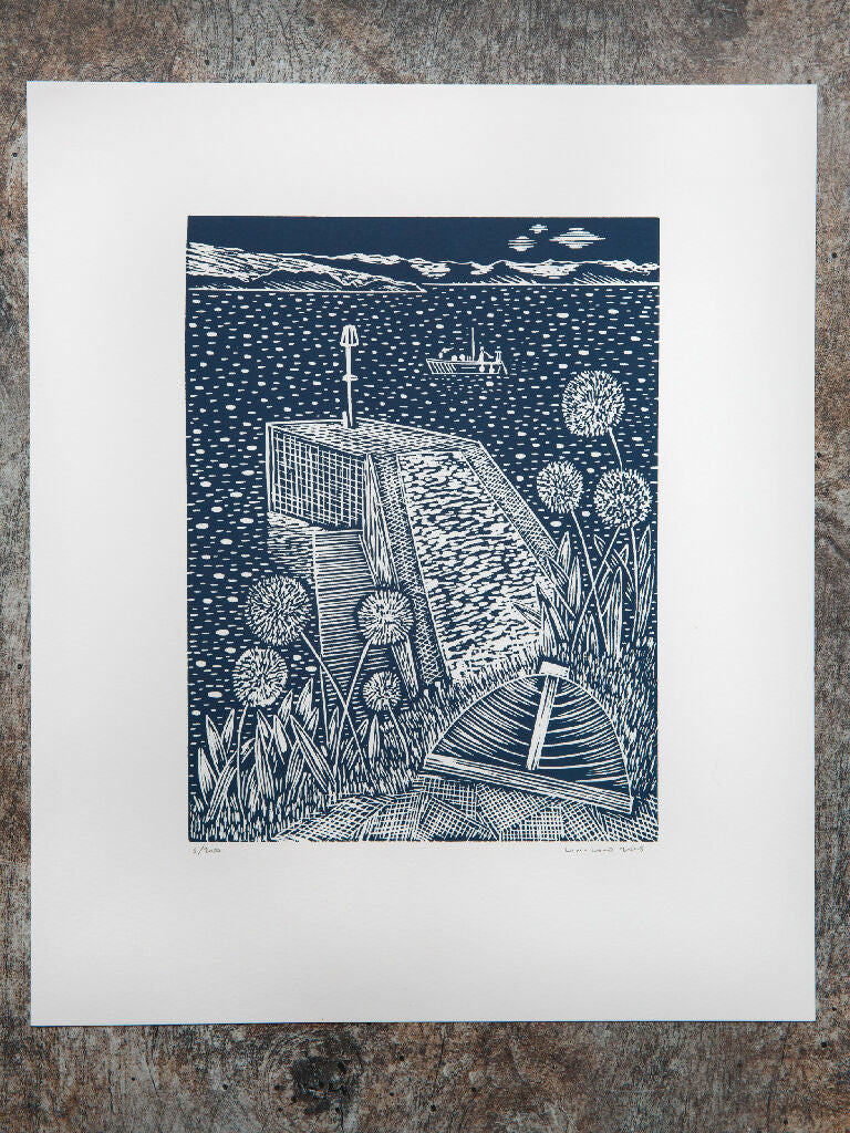 Limited edition lino print, carved while exhibiting in the Fisherman's Shelter throughout the summer, it's a beautiful scenic spot and the source of endless inspiration.