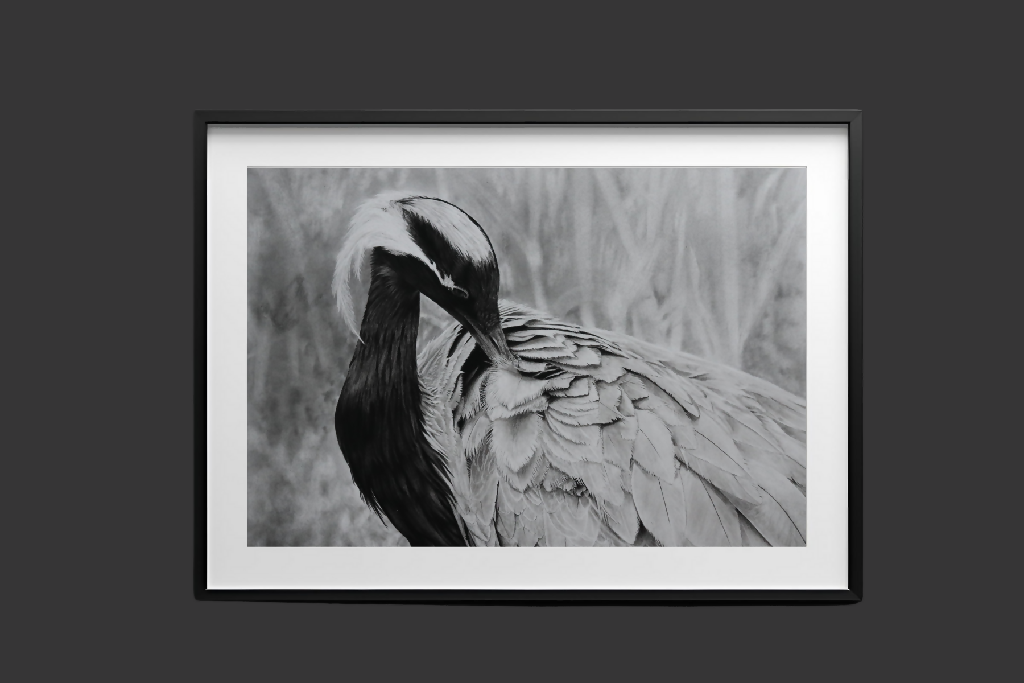 A limited edition print of my original preening demoiselle crane artwork. Printed on museum grade fine art rag, overall size is 30x21cm, which includes a white border around the image. The border contains my signature, the edition number of the print and the title.
