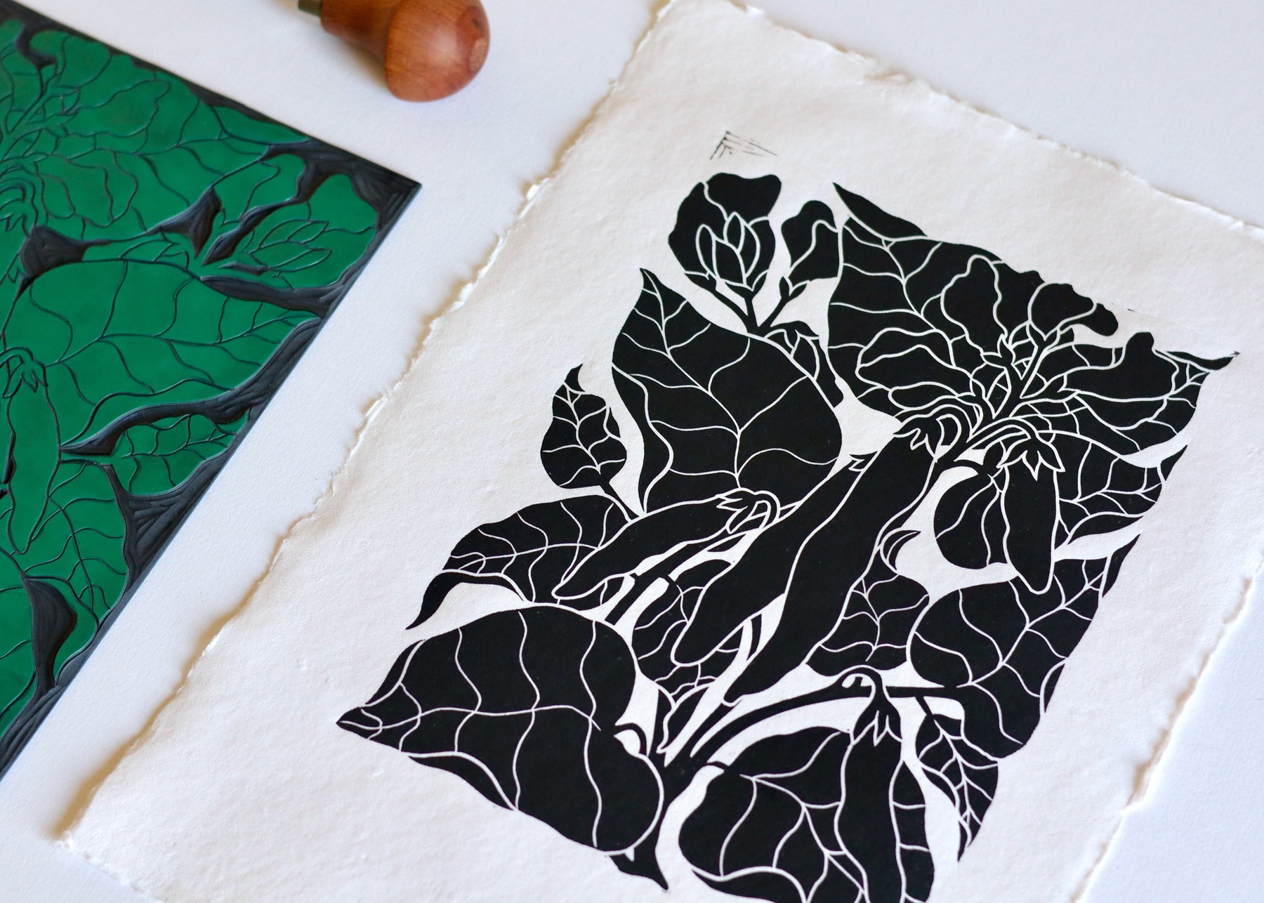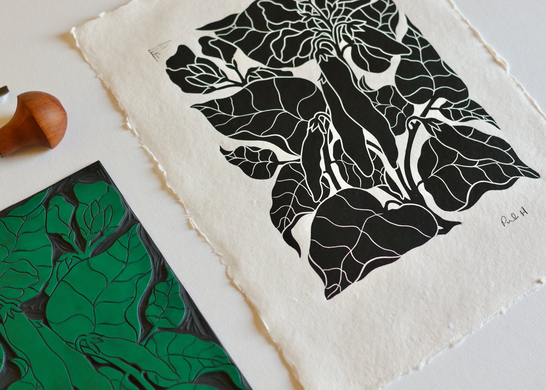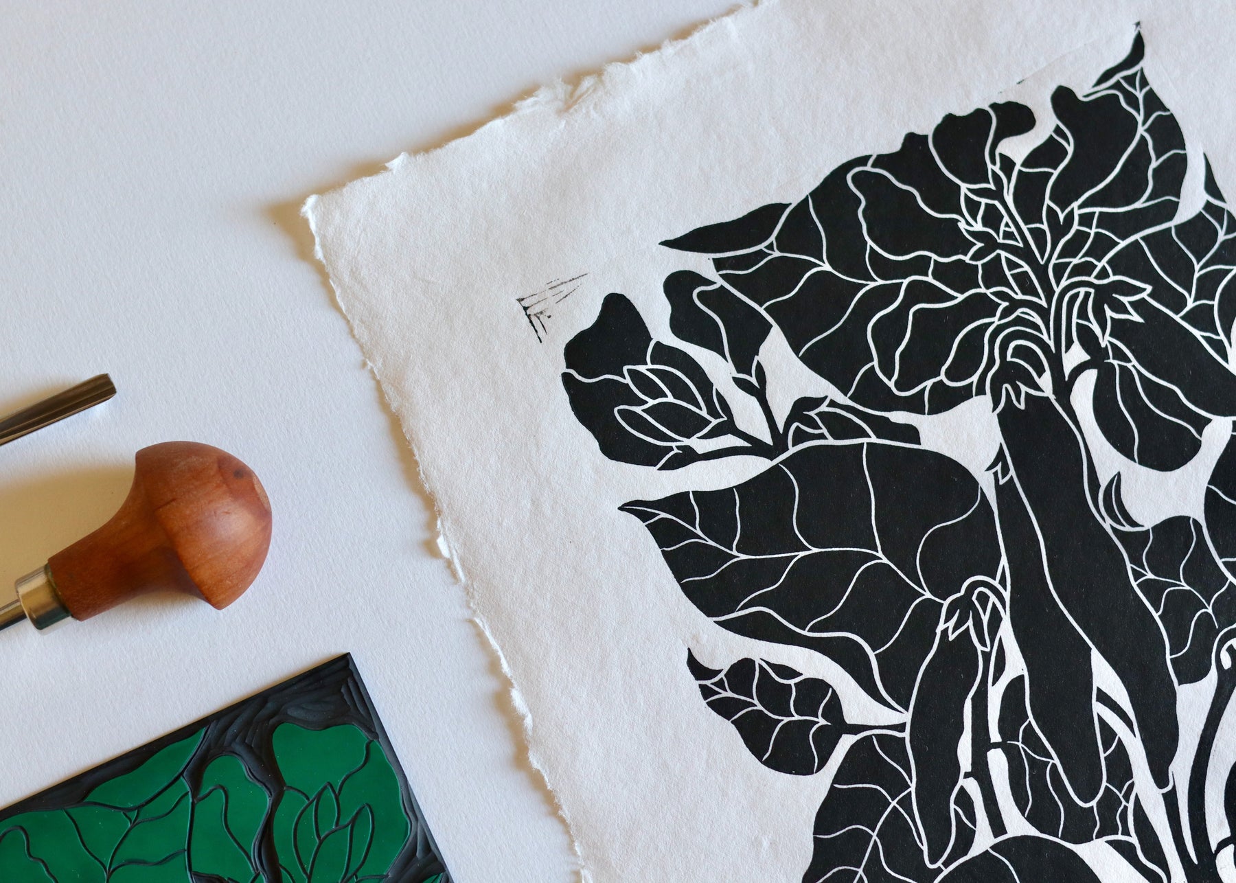 Each print is individually printed using traditional linocut techniques, creating a bold contrast between the rich black ink and the textured white cotton rag paper. The design captures the runner bean's distinctive flowers and elegant pods nestled among a tapestry of lush foliage, showcasing the plant's natural dynamism and graceful structure.