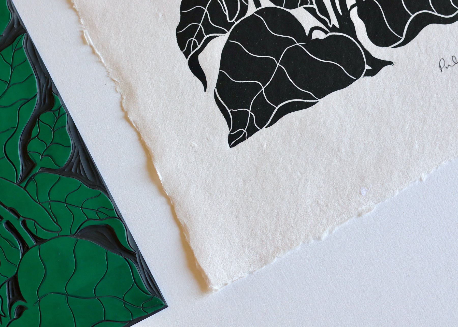 Original, hand printed artwork on handmade 250gsm cotton rag paper, which is acid-free & pH neutral. It features four deckled edges, it is heavily textured with natural flecks throughout for that perfectly imperfect finish.