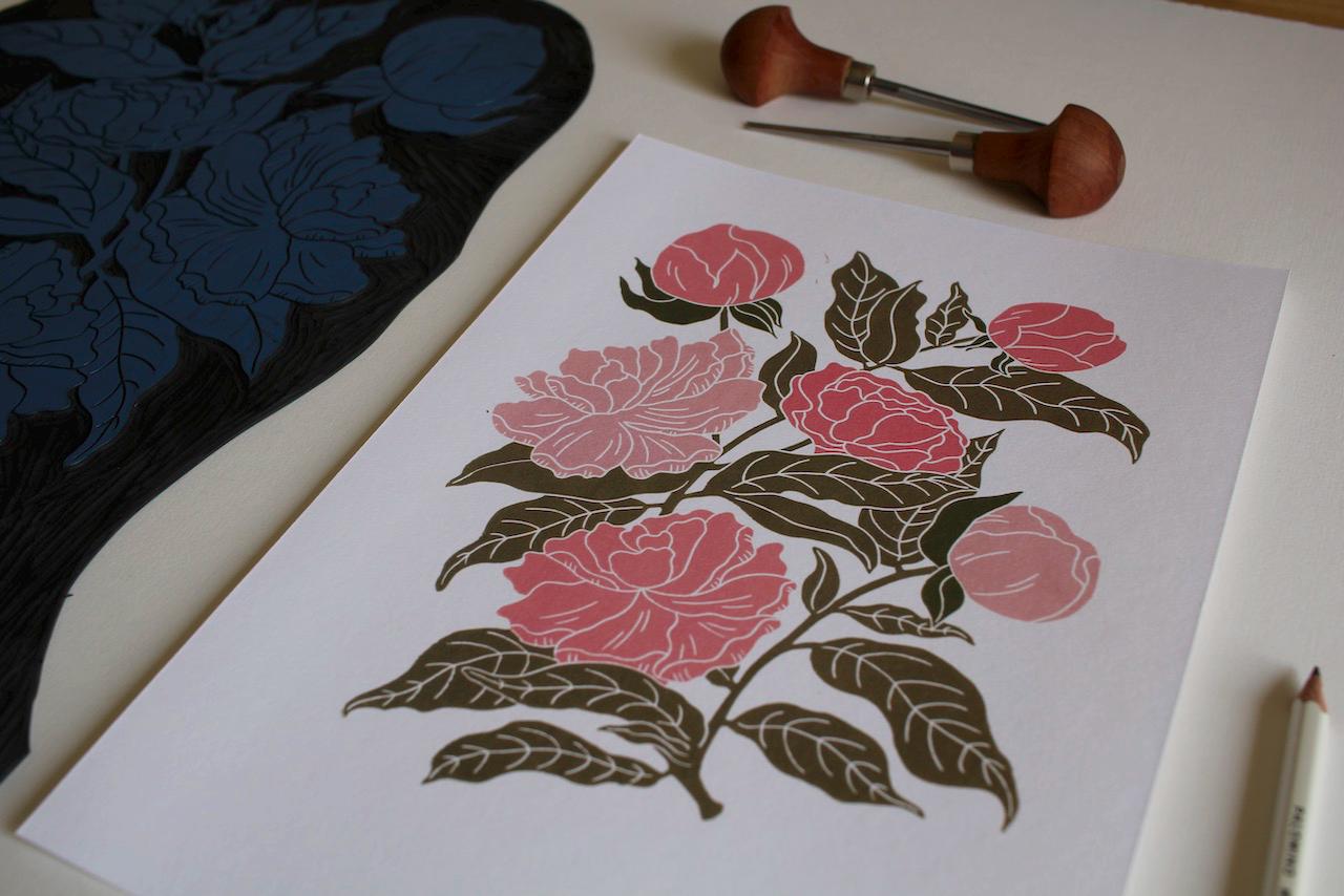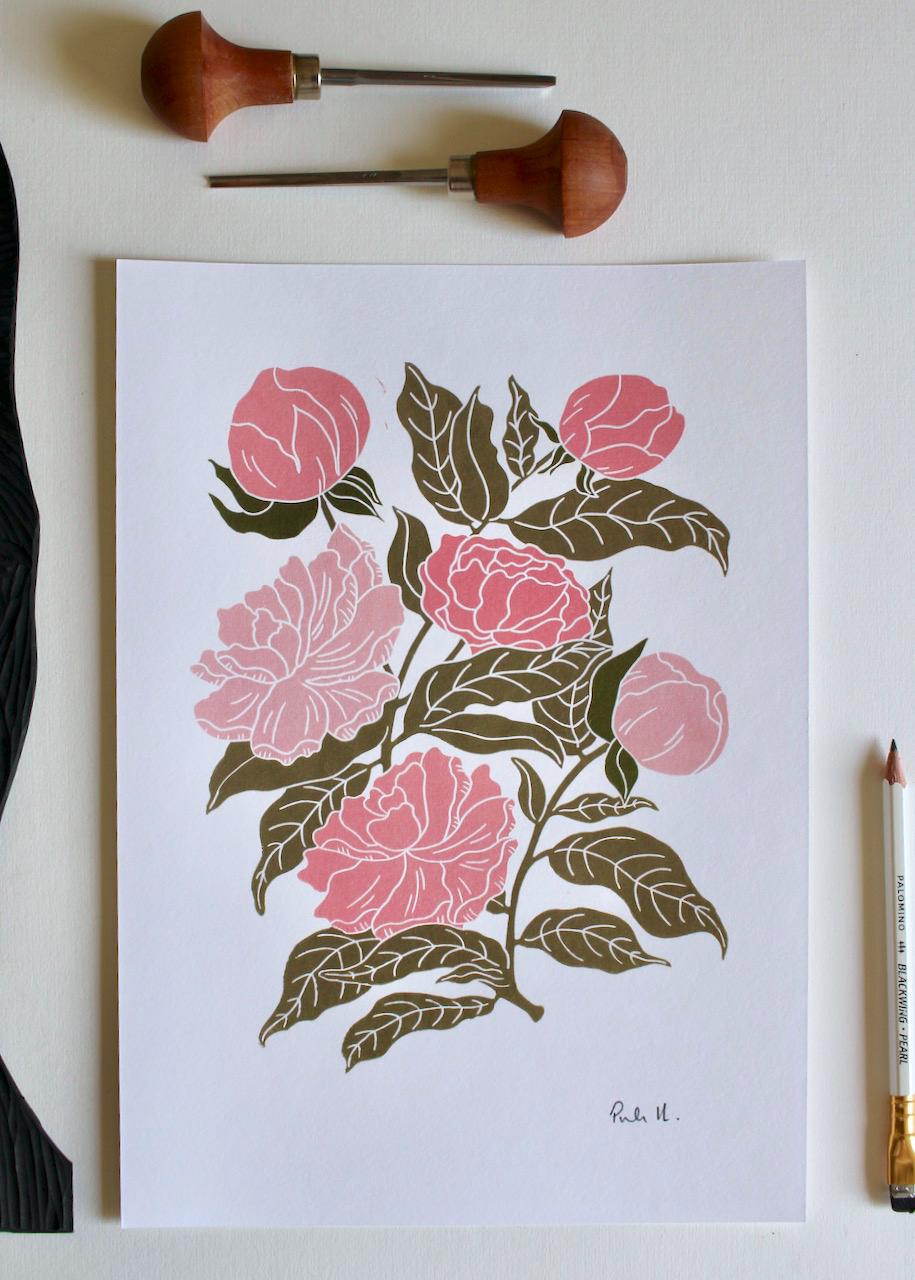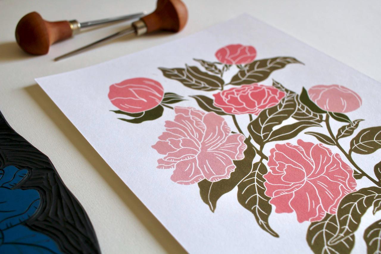 Is there any flower more beautiful than the Peony? Filed with big, beautiful blooms, the peony flower is a symbol of love, honour, happiness and wealth. Peonies are traditionally gifted to express love, best wishes and joy. With a short flowering season, you can enjoy peonies all year round with this linocut art print. Originally created using traditional relief printmaking techniques and carefully printed digitally on to tactile 300gsm cotton paper.