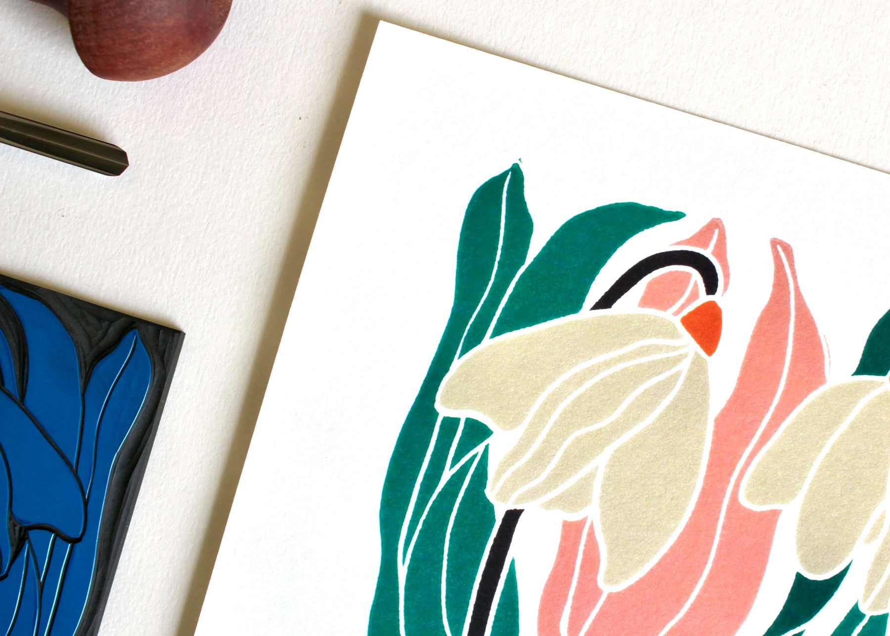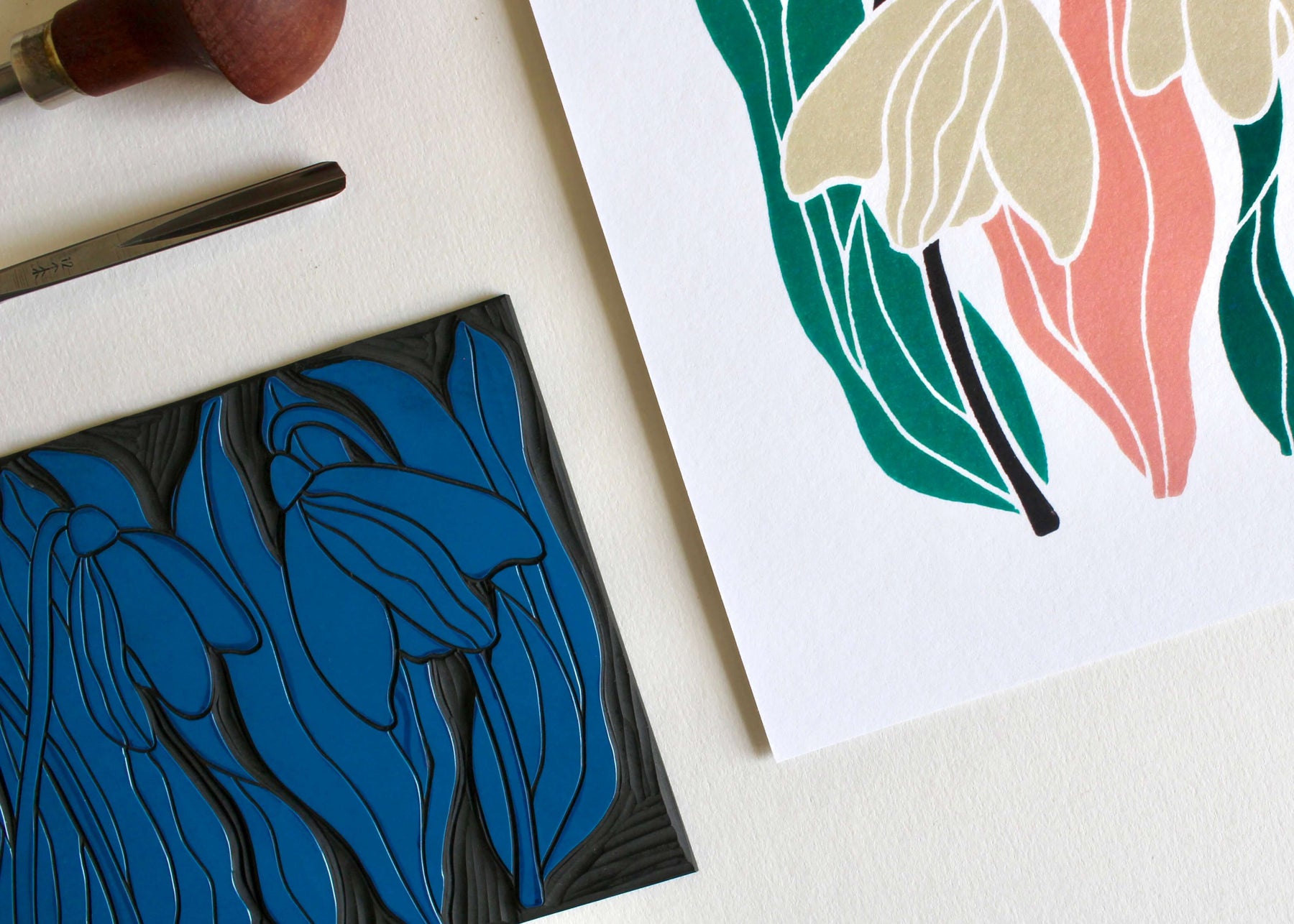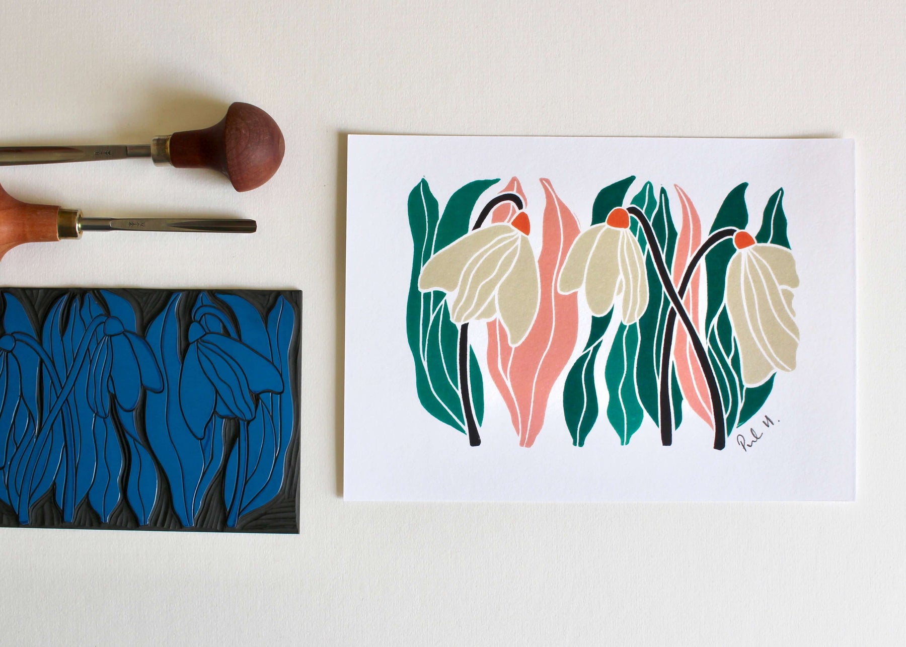 Snowdrops Linocut Art Print | A5 or A4 Print on Cotton Paper