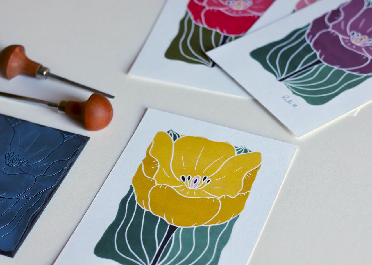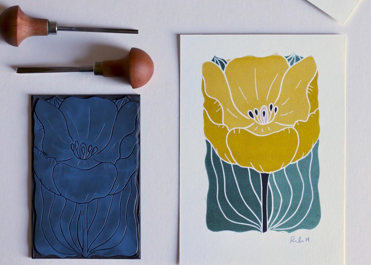Yellow tulip flowers represent cheerful thoughts and hope as well as strength and growth. This art print features an original linocut design, originally created using traditional relief printmaking techniques. Printed digitally in-house on to superior quality, 300gsm, acid-free, cotton paper.