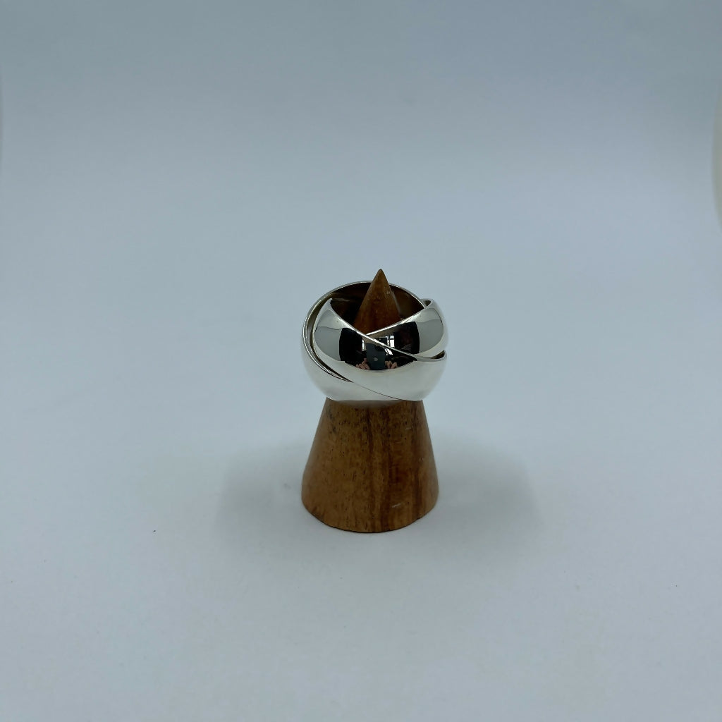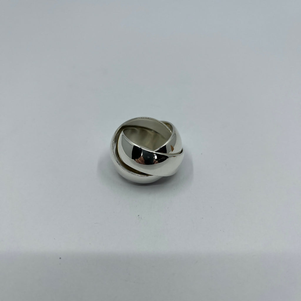 Handmade in my own workshop in West Yorkshire I re-purposed three 925 silver wedding ring blanks into this chunky rolling ring by interlocking the three bands and giving the whole ring a beautiful polished mirror finish.