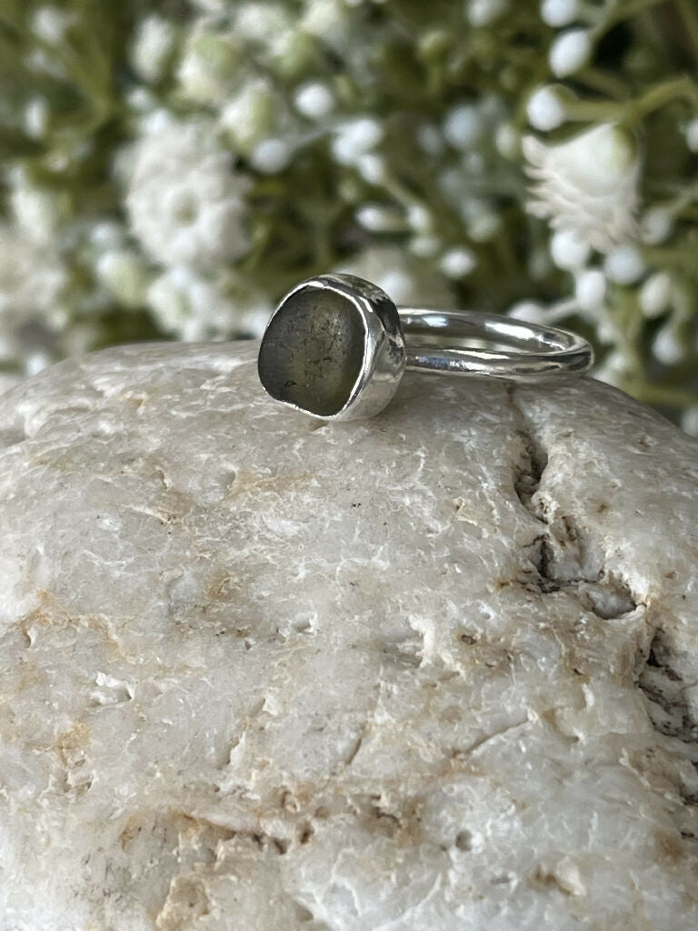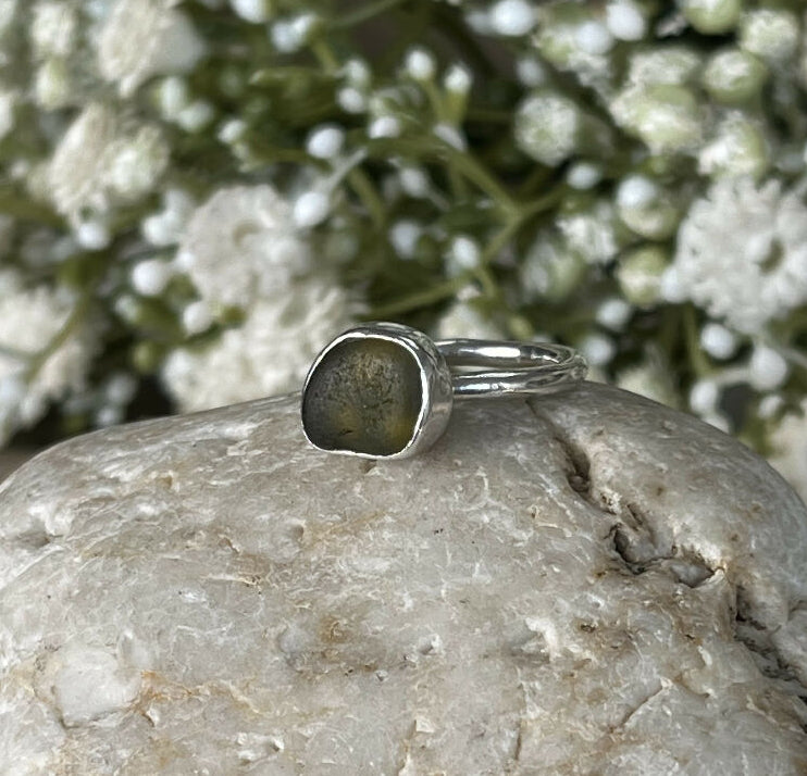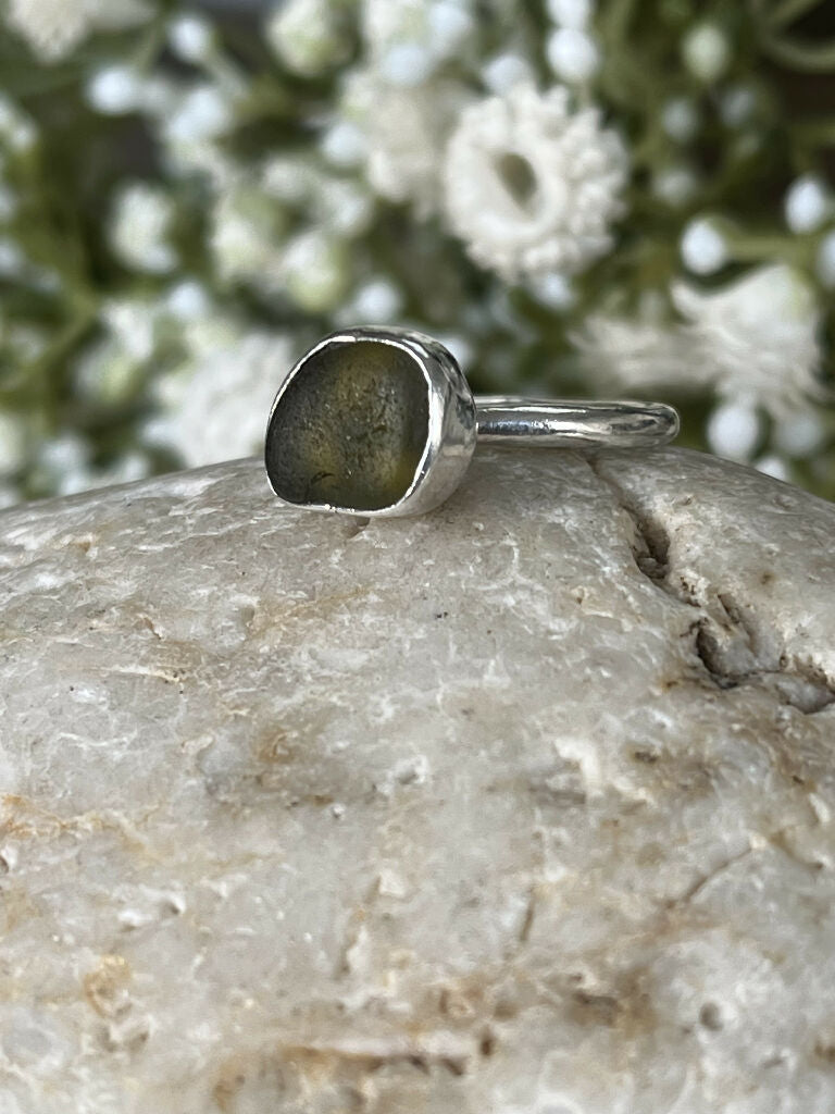 A lovely sea glass ring, handmade with recycled sterling silver and green sea glass collected by myself from a North Devon beach, naturally rounded by the waves.