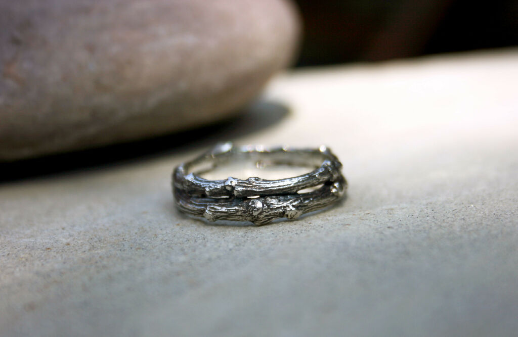 Rustic and natural, the design is created from two twigs, each cast from a real twig and transformed into solid sterling silver using the traditional Lost Wax Casting technique. The twigs are shaped, formed, and soldered together to create a single statement piece. The interior is polished to a smooth mirror finish for comfortable, everyday wear.