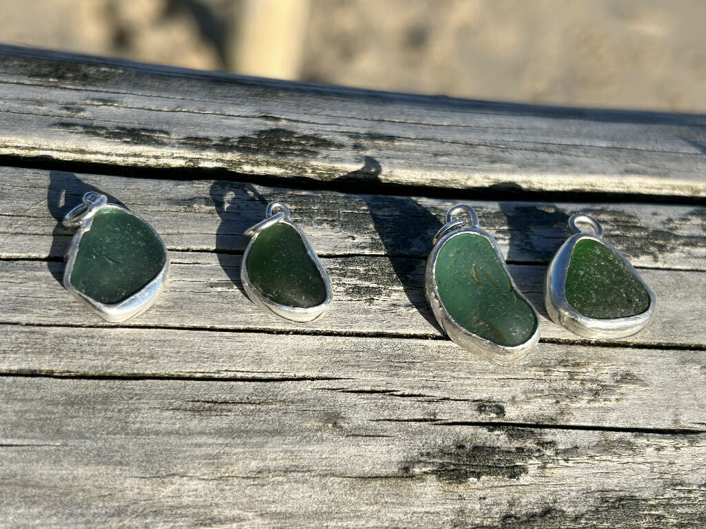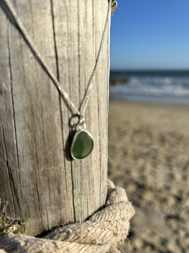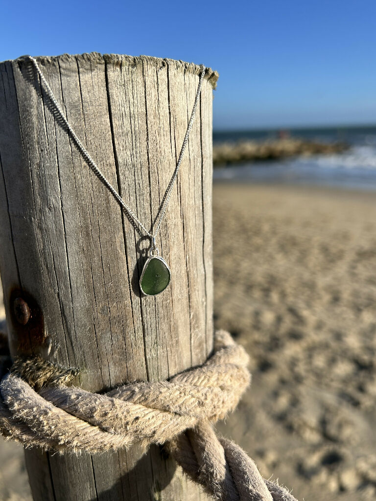 Green turquoise Seaglass and silver pendant necklace featuring a lovely colour green Seaglass.The seaglass is wrapped with recycled silver.
