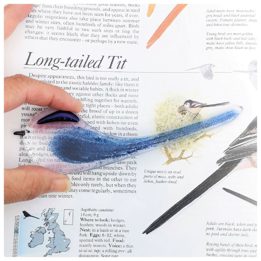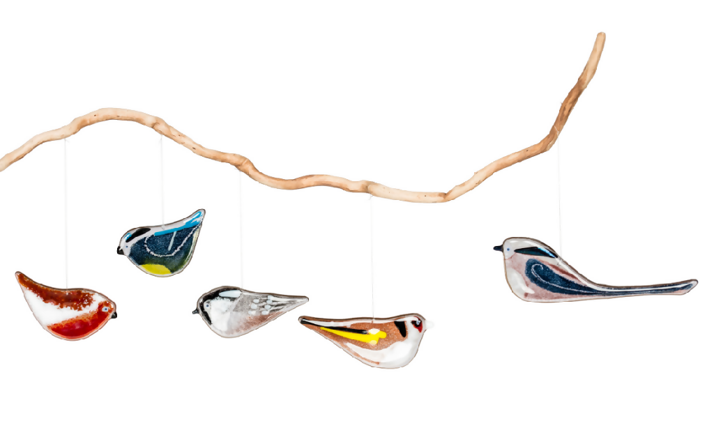 You will receive a blue-tit, coal-tit, long-tailed tit, goldfinch and robin, all strung on a length of invisible thread so they appear to float effortlessly.
