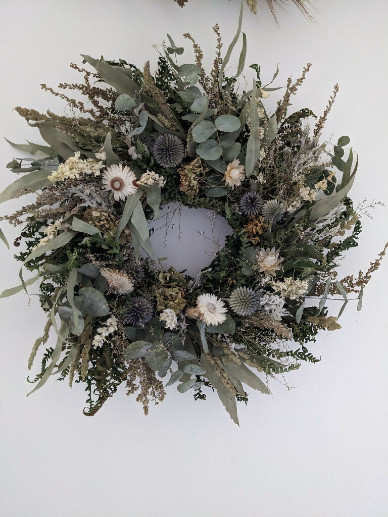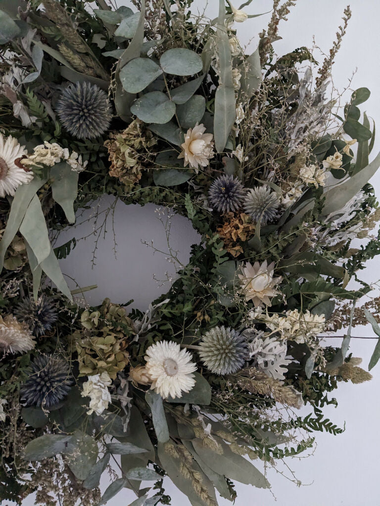 Natural dried flower wreath with blue thistle. Approximately 50 cm.