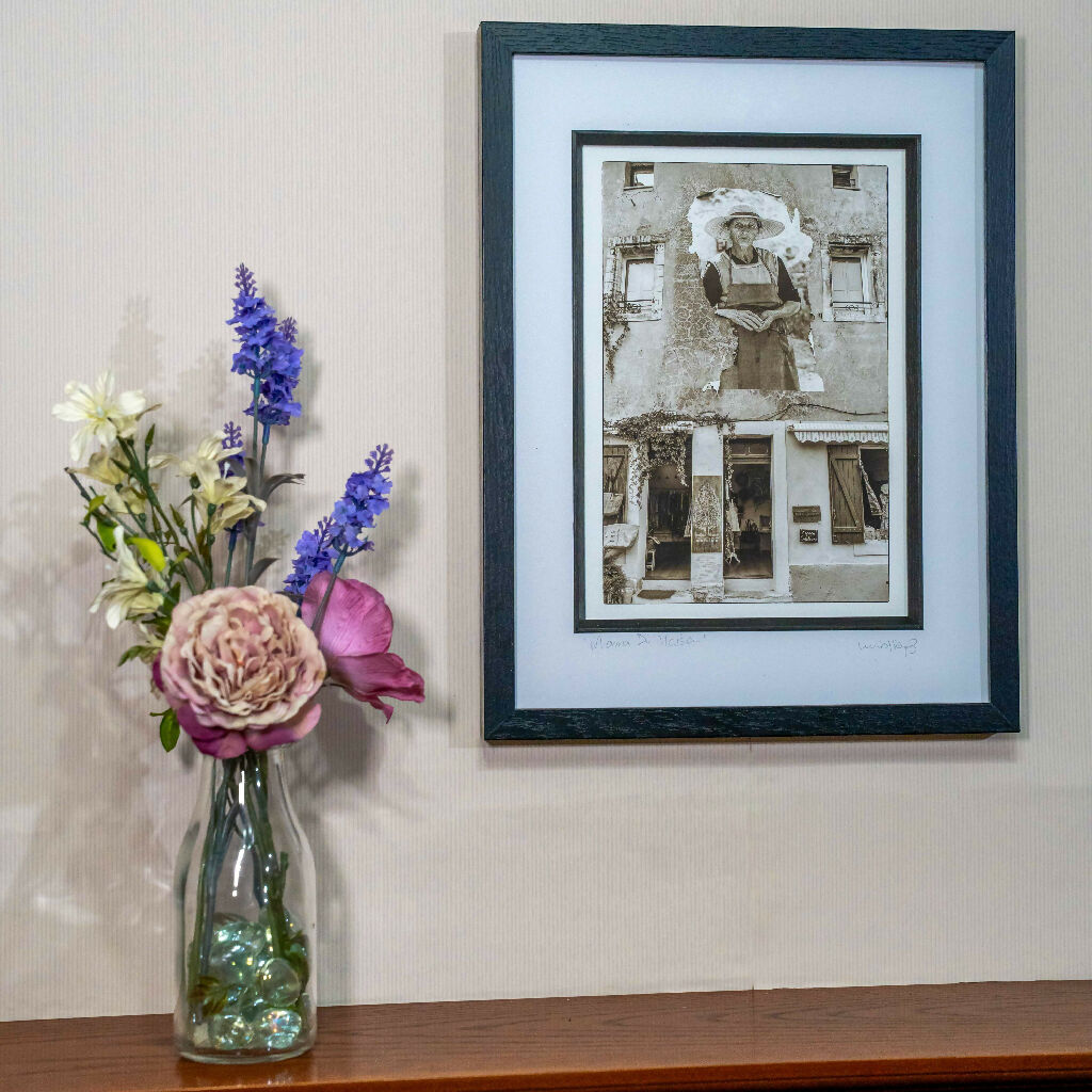 A striking photograph celebrating an elderly field worker, her hands, gnarled and powerful, mounted proudly on the stone walls of the hilltop village of Gordes, Provence. Printed on premium fine art paper and presented in elegant black frames with a deep black inlay.