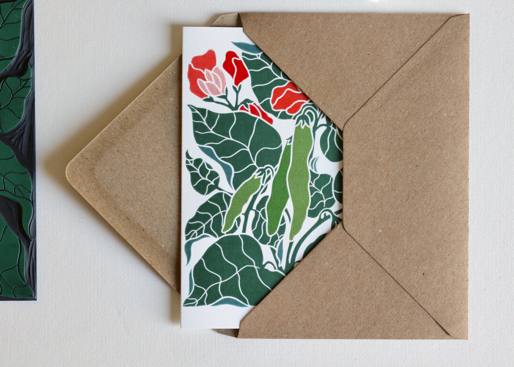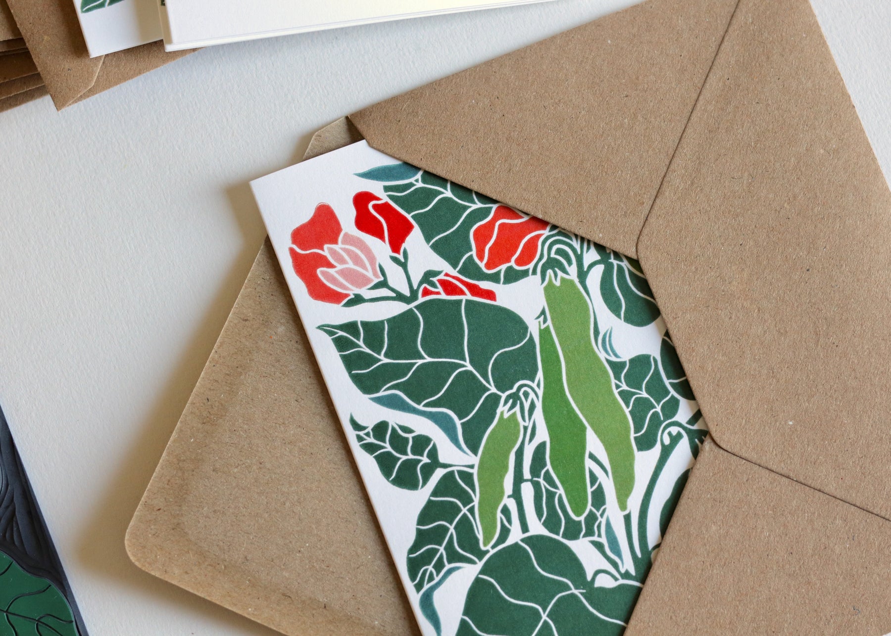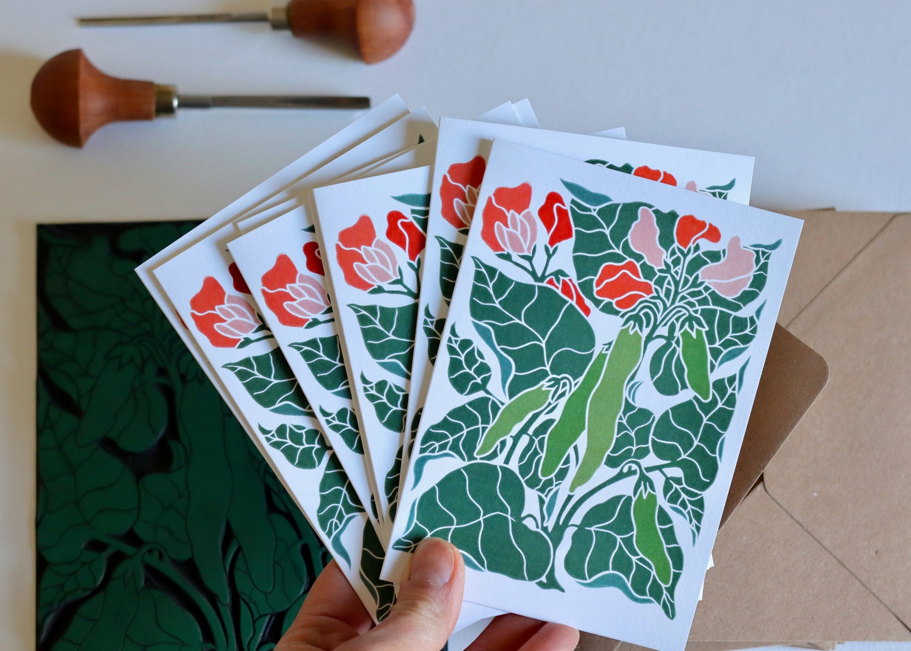 A set of 8 Runner Bean notecards featuring original linocut artwork from my Heritage Kitchen Garden collection. This design captures both the ornamental beauty of the runner bean plant and practical value in the traditional British kitchen garden.