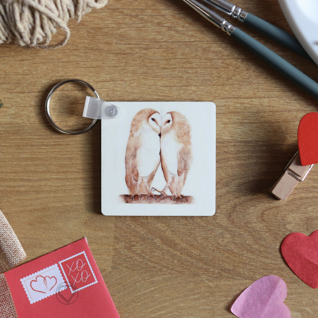 Barn owls keyring finished in a high gloss finish mdf and printed on both sides.