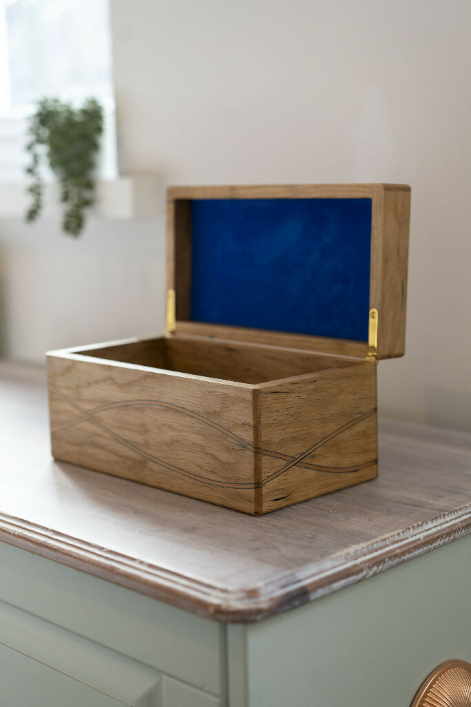 Spalted wood box with blue lines through the body. The oak was cut in waves and handmade blue veneer lines inserted. The lines are visible both inside and outside of the box. Blue birch veneer borders pear wood strips.