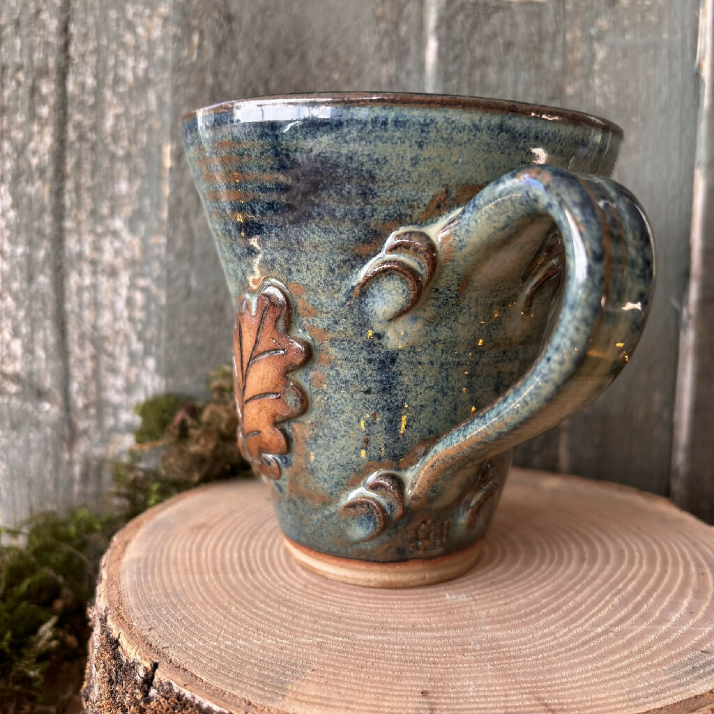 Mug with applied oak leaf decoration ceramic pottery rustic Blue