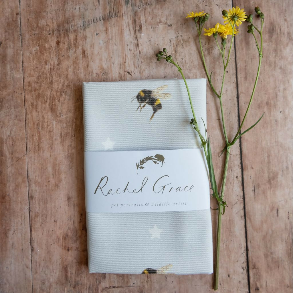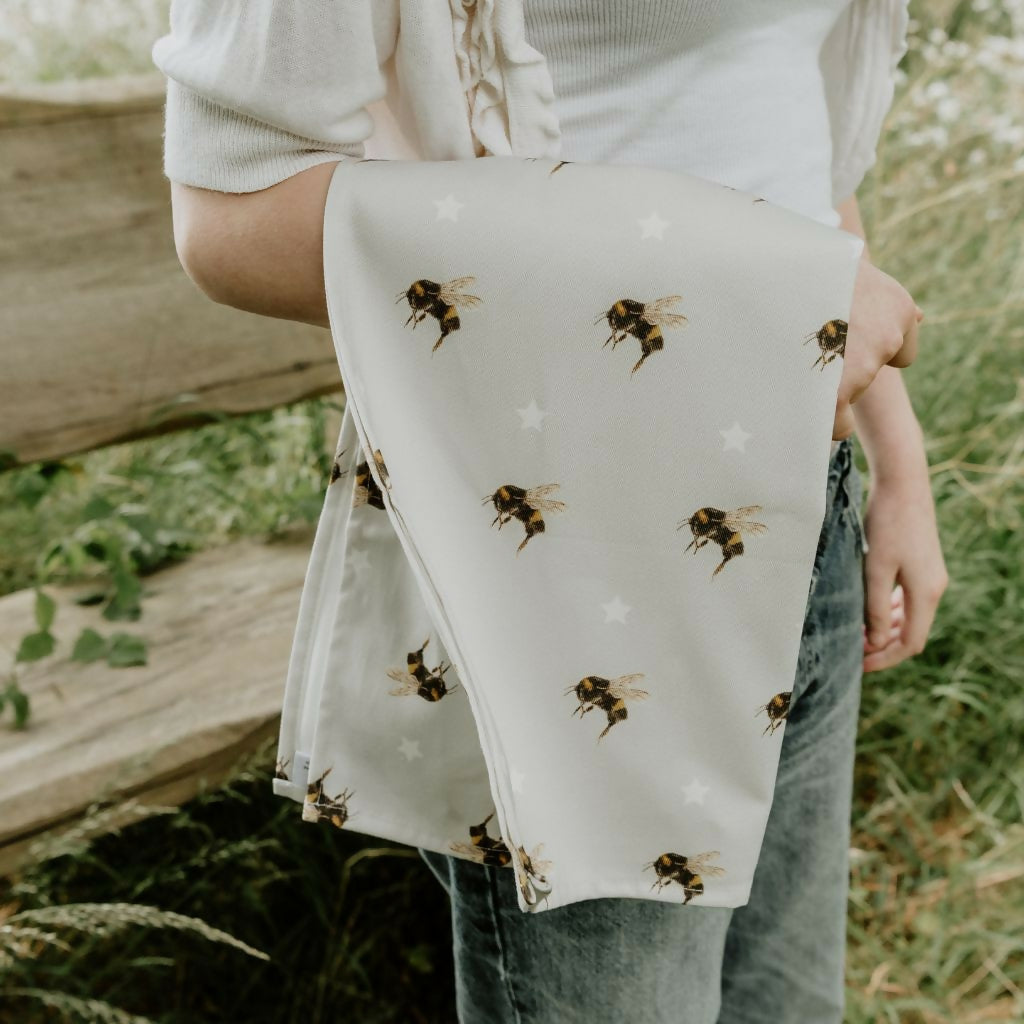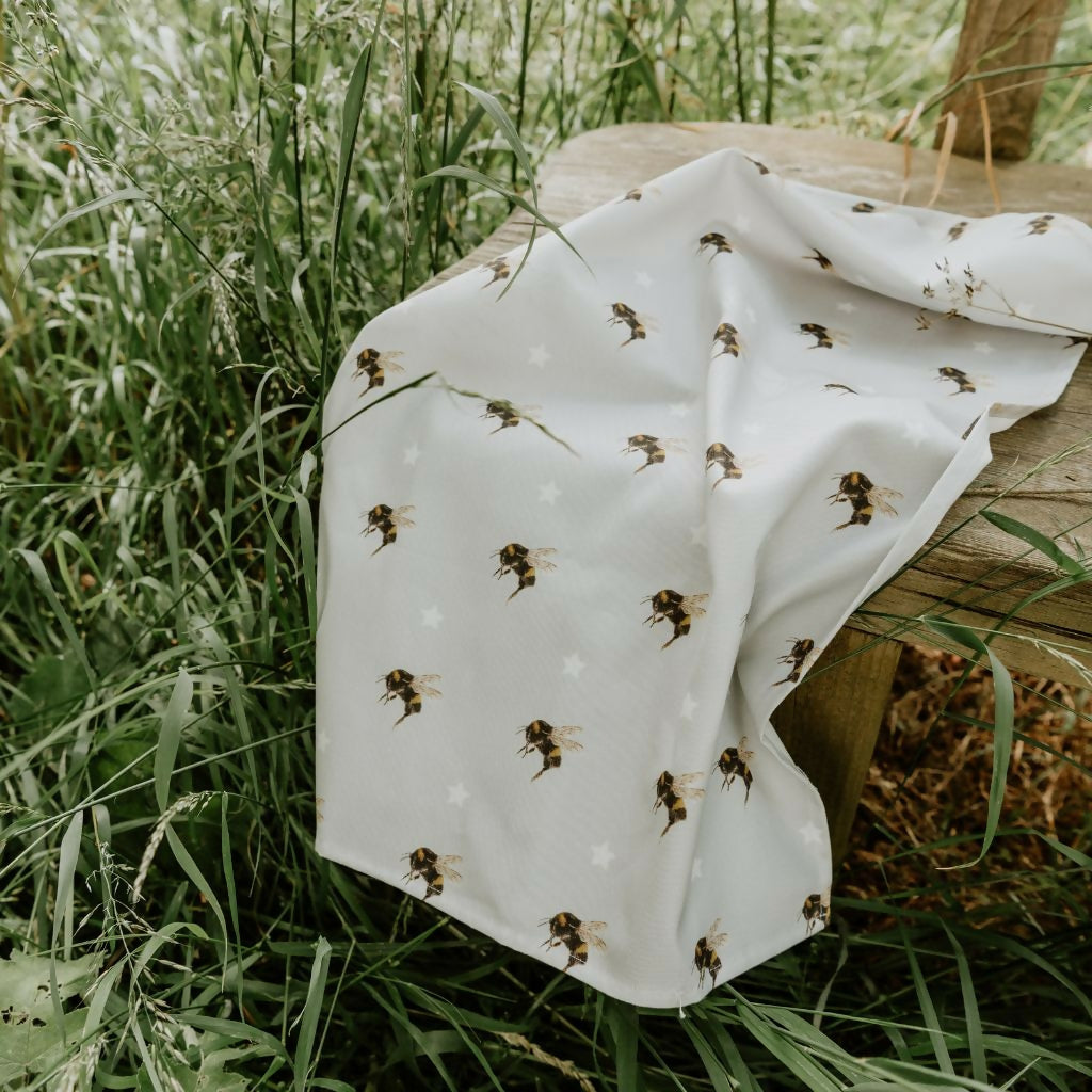 Featuring Rachel’s original bee artwork, the repeating motif is printed on a light grey background with white stars, and is made from 8oz cotton drill.