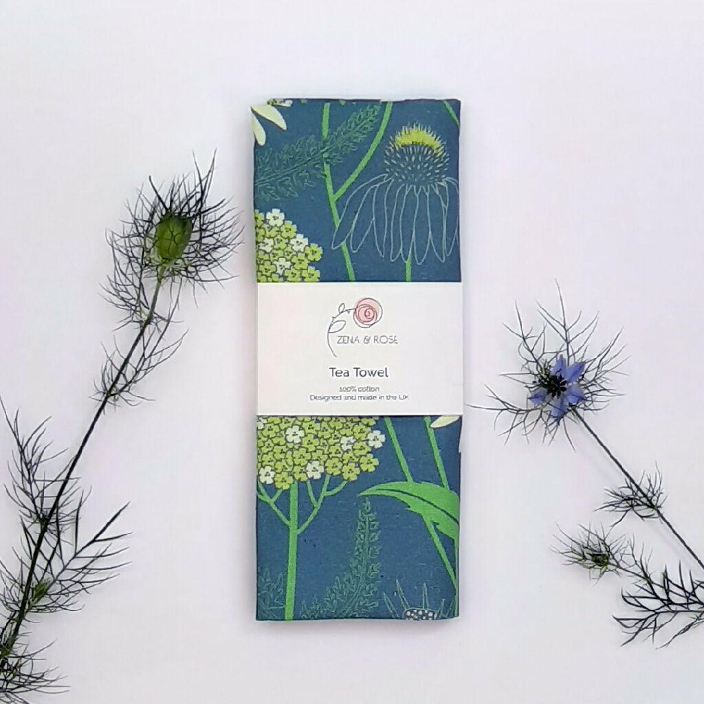 This blue tea towel featuring summer flowers echinacea and achillea will certainly brighten up your kitchen. It comes wrapped in a card band, perfect for giving as a gift to gardeners and plant lovers.
