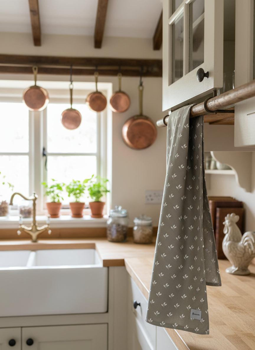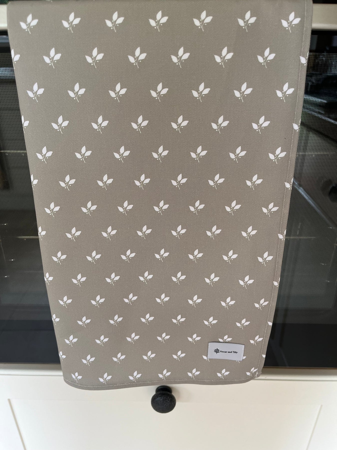Beautifully designed and made in the UK. Oscar and Tilly are delighted to introduce a new range of Kitchen textiles with a lovely cream leaf design. This is such a pretty design with an olive base. Add a lovely pop of colour to your kitchen of our wonderful leaf design.