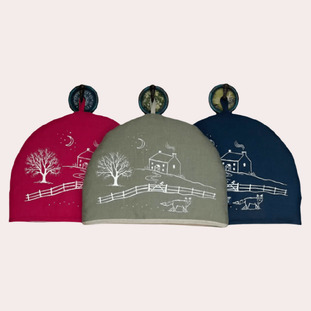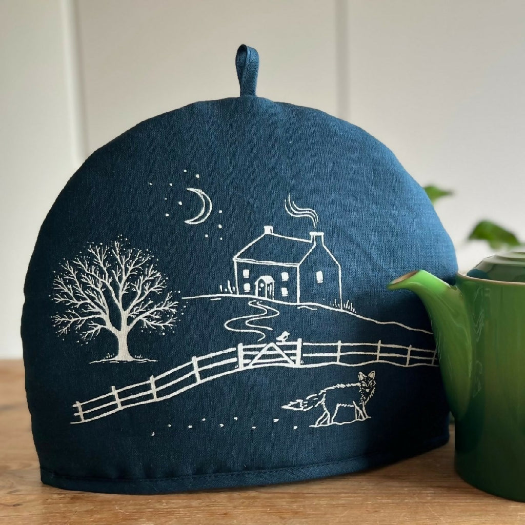 This beautiful linen tea cosy captures the quiet magic of a wintery night in the countryside, with the handprinted design picked out in soft white ink.