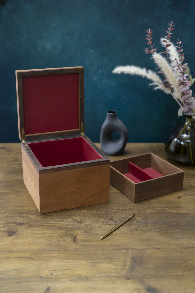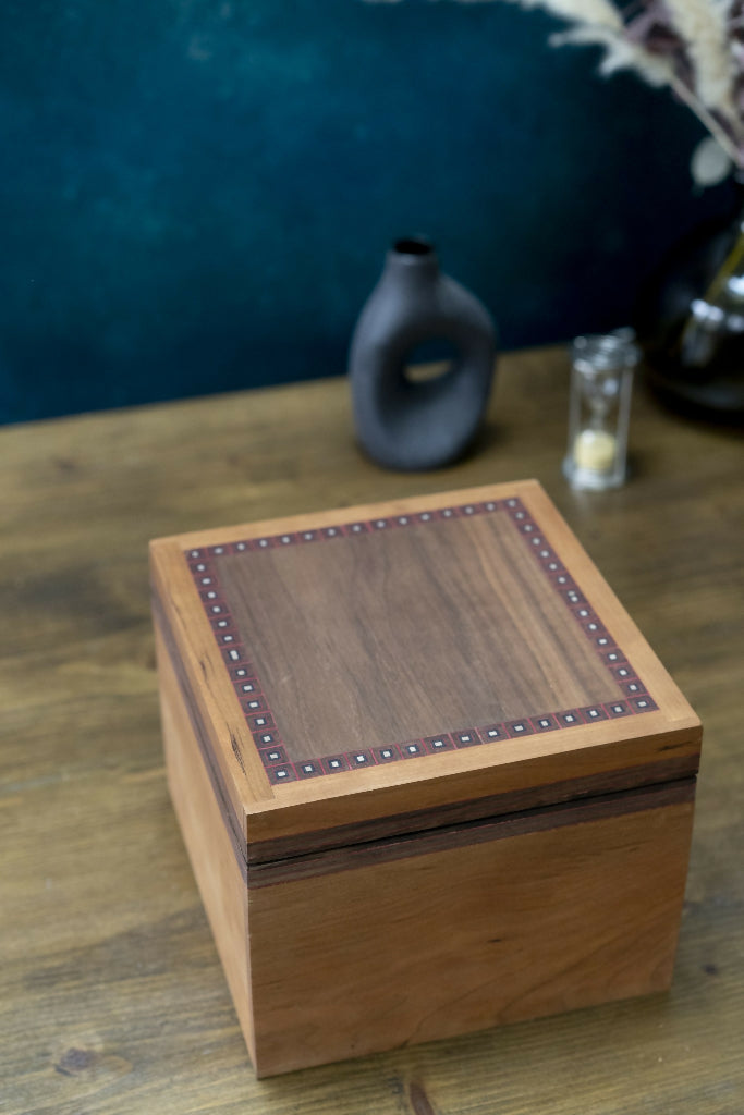 Large cherry wood box with walnut lid, surrounded by red, white and black wooden squares.