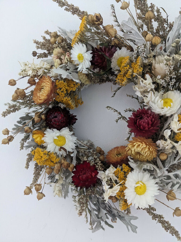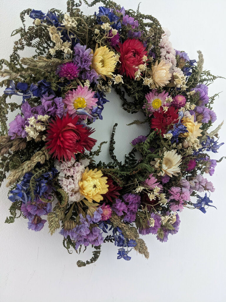 The flowers I use for my work are mostly grown and dried by me. The variety of flowers changes through the year with the seasons and growing conditions.