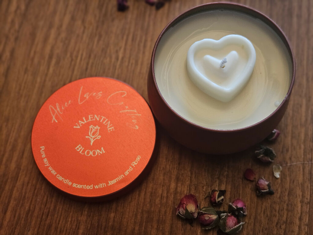 Soy wax candle delicately fragranced with Rose and Jasmin with a soy wax heart-shaped topper.