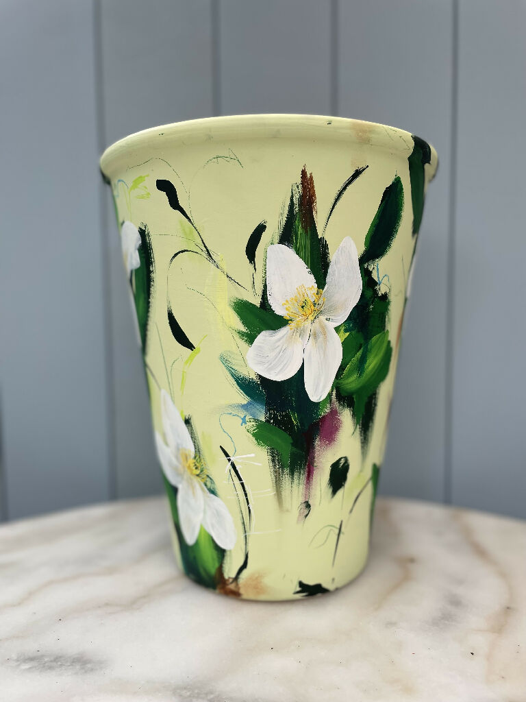 Discover the beauty of this beautifully hand-painted interior terracotta plant pot, featuring a serene pale green background adorned with delicate white clematis flowers. Each pot is a unique, one-of-a-kind creation by Kate, designed to be cherished for years to come.