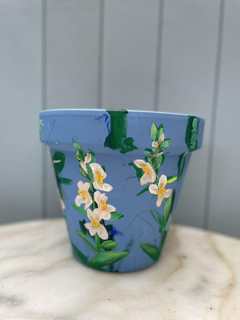 Discover the beauty of this beautifully hand-painted interior terracotta plant pot, featuring a pale blue background adorned with snap dragon flowers. Each pot is a unique, one-of-a-kind creation by Kate, designed to be cherished for years to come.